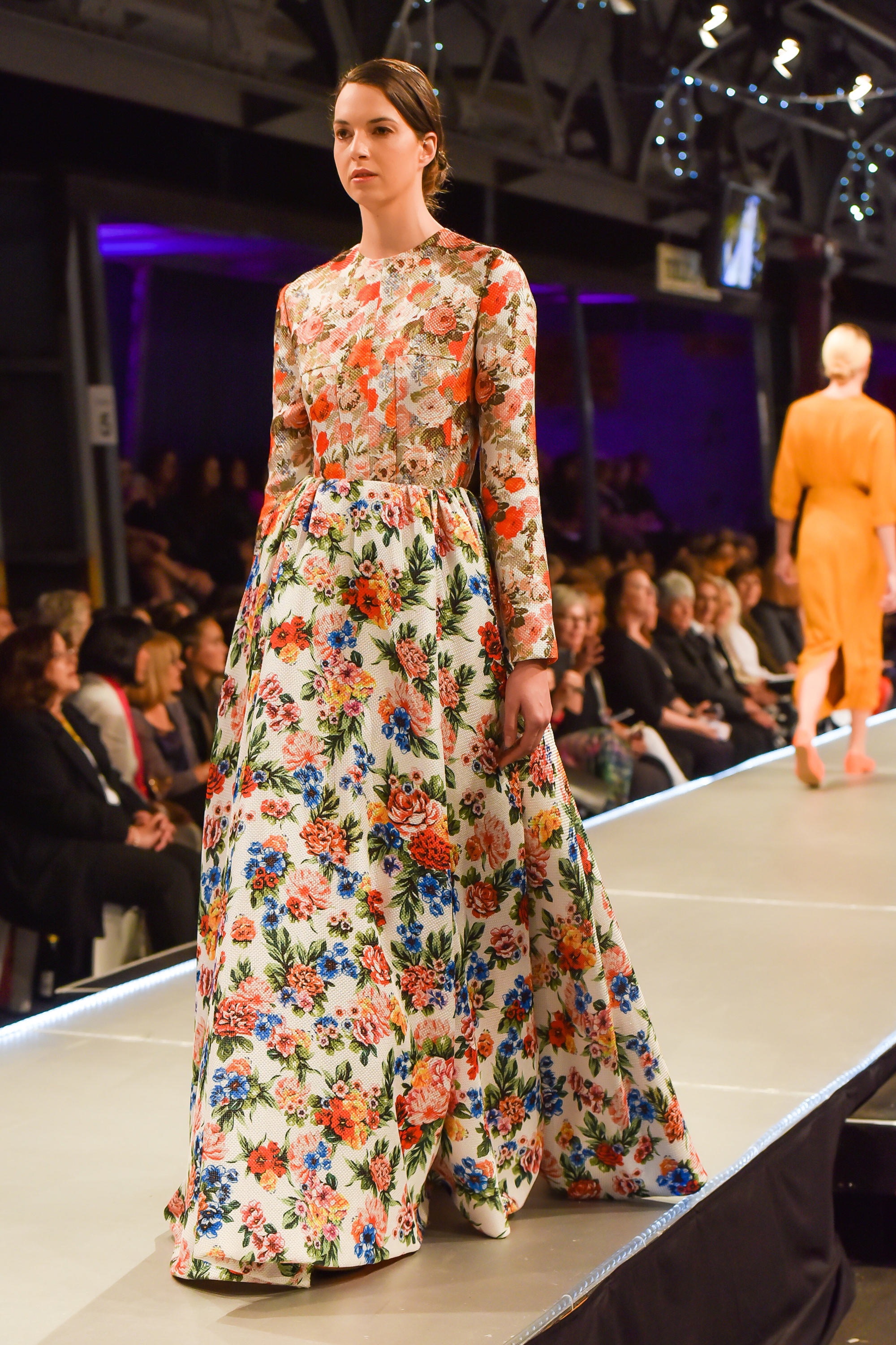 This dress was the last look in Emilia Wickstead's SS 2016 collection show. Bold contrasting chintzy prints combined in a demure, floor-length full skirted dress with unusual bodice seaming details. Kate Finnegan writing in The Sunday Telegraph said "the surprise was the puffy bustle-like form at the back. It was like a maternity dress in reverse and the effect was odd and historic and utterly desirable. When a designer can do that with a dress that makes you balloon in strange places you know she's playing a strong game." In March 2016 Emilia showed her collection again to audiences at iD Dunedin Fashion Week.