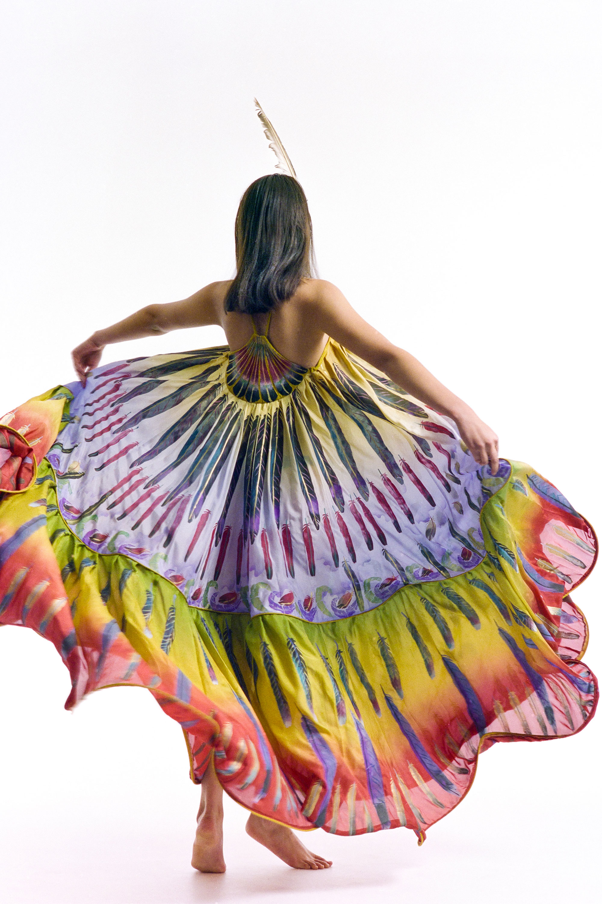 This dress is reminiscent of Susan Holmes' voluminous empire line dresses from the 1970s that were embellished with her signature prints. The dress placed second in the Silk section at the World of Wearable Arts Awards in 1995. The yoke is cut from old woven bag, sponged with print paste and appliqued with silk. The silk skirt is cut roughly, dyed, then cut accurately, stencilled and sewn. "I remember at the time wanting to add more to make my entry more spectacular, but the dress seemed to refuse all my offers and stayed pure and simple!"