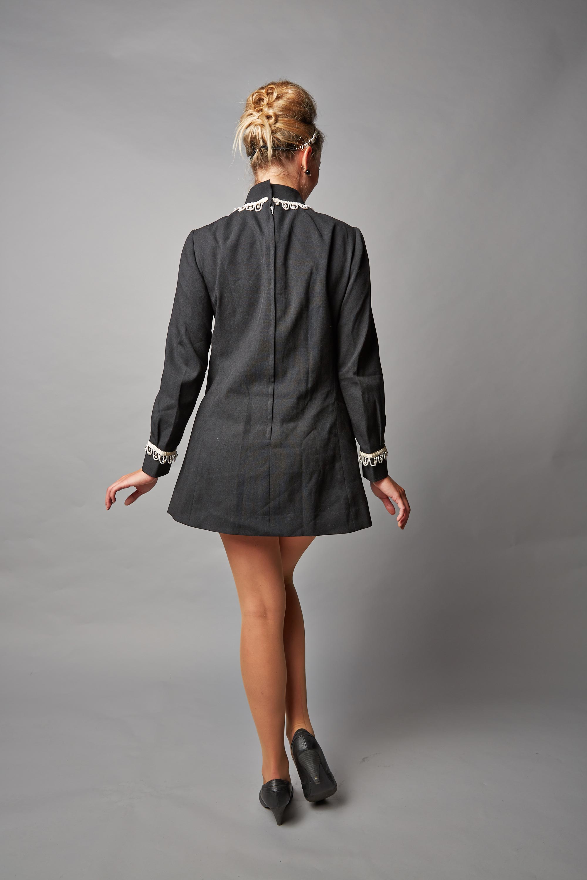 Pearl trim around the collar and cuffs.