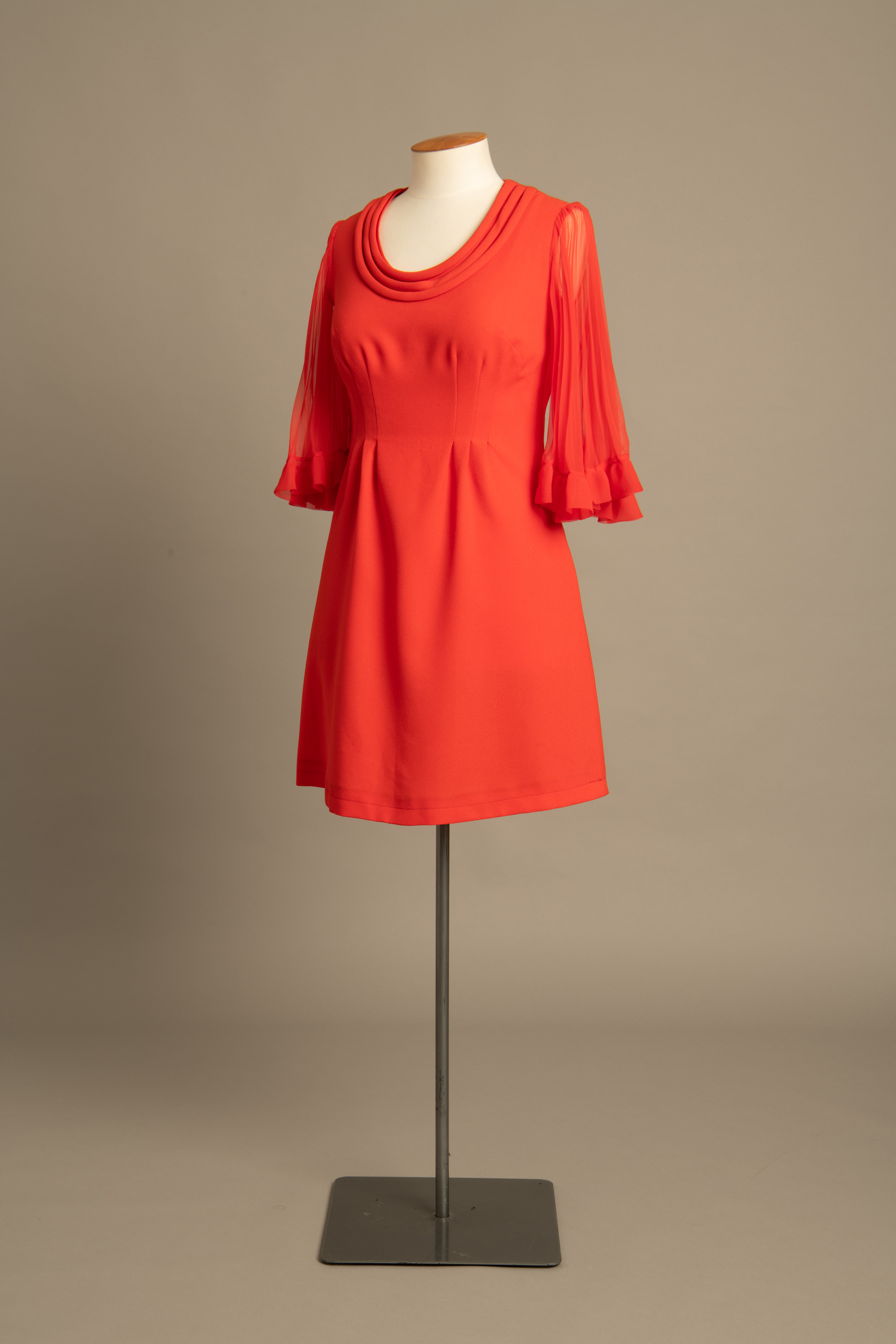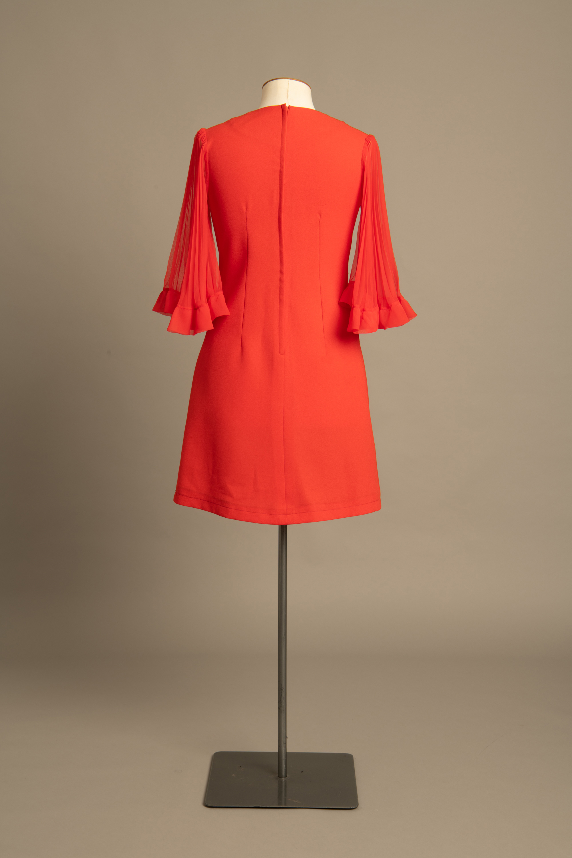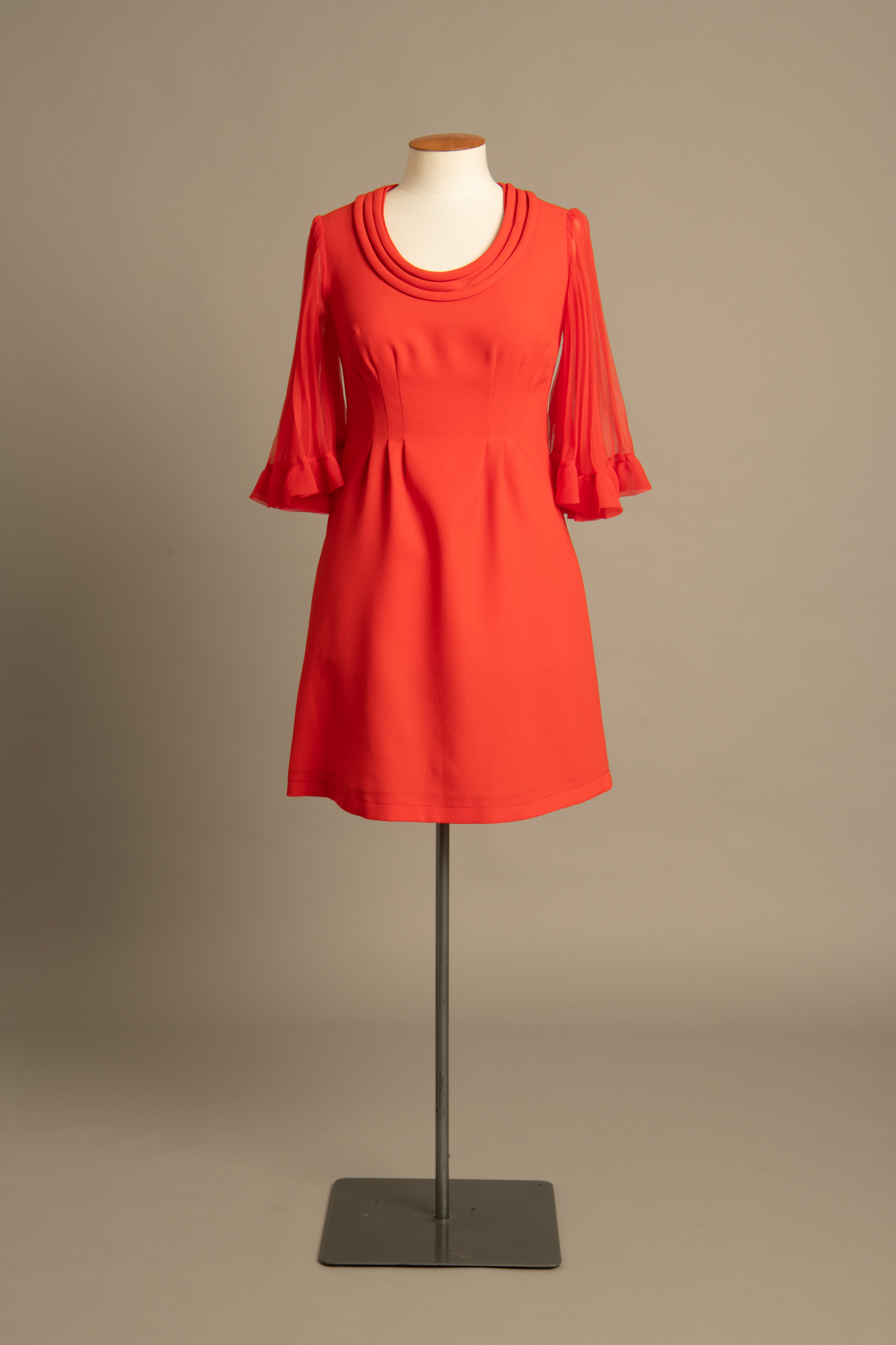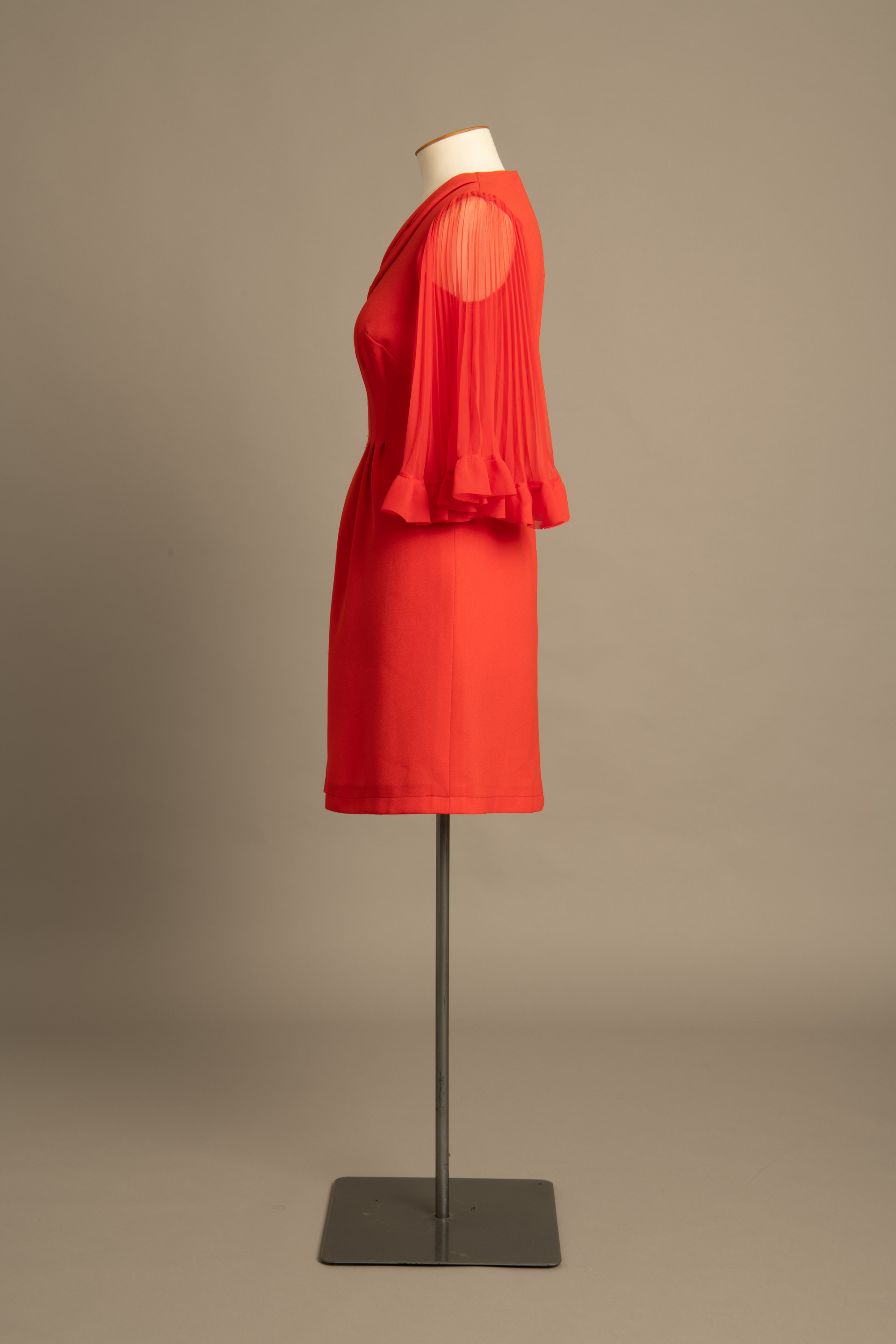 The dress has sheer pleated sleeves that flare at the elbow. The neckline is trimmed with 3 bands of self fabric roulé.