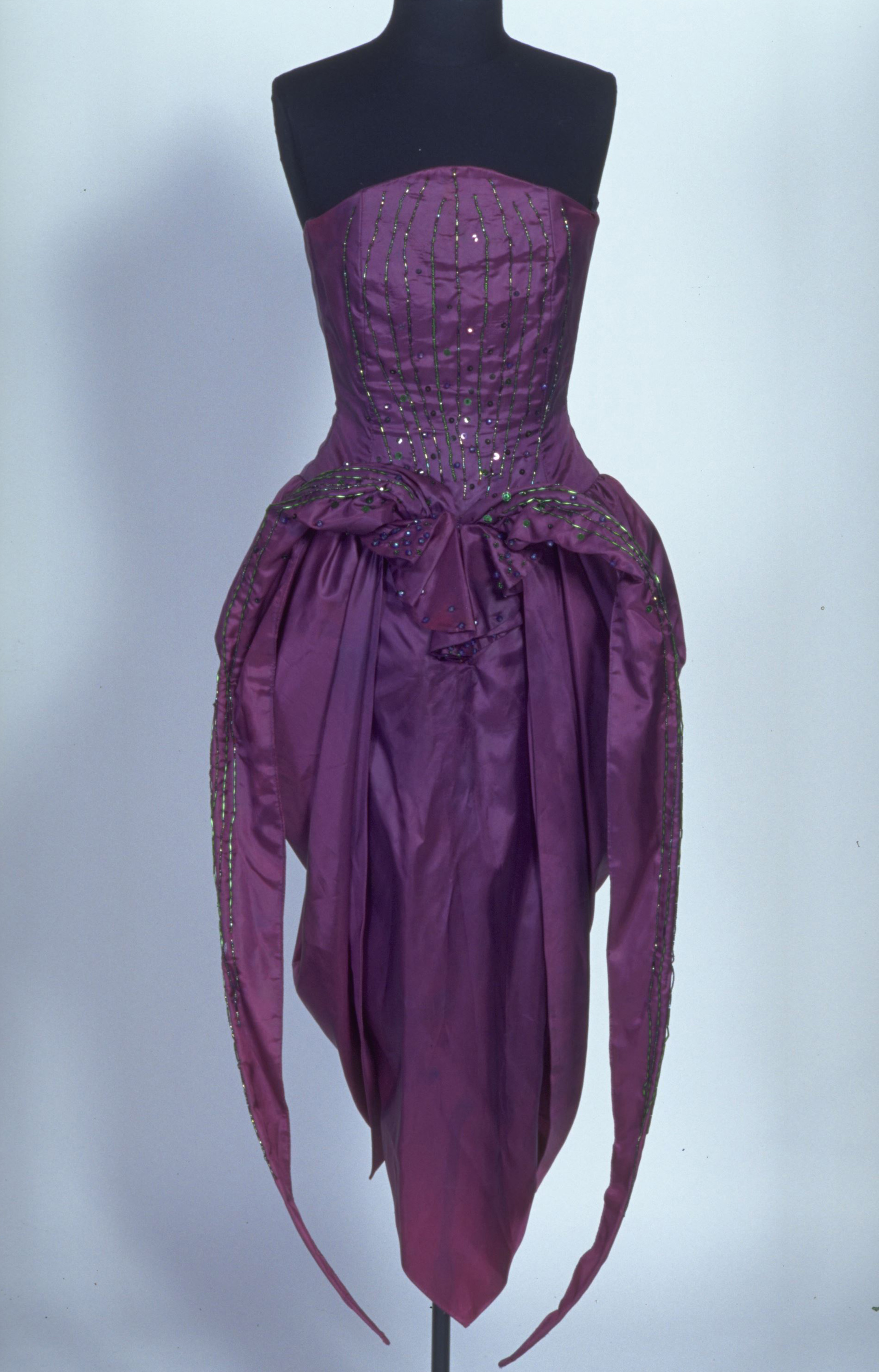 Kerrie Hughes designed this dress in 1984, not long after her return to Wellington from Auckland. She had recently closed her business Svelt that she owned with Di Jennings. That same year, Kerrie won a Highly Commended award in the Benson & Hedges Fashion Design Awards and in two years later, she won a Queen Elizabeth II Arts Council and Craft Council grant to study the costume collections at the Metropolitan Museum of Art, the Los Angeles County Museum and the V&A in London.