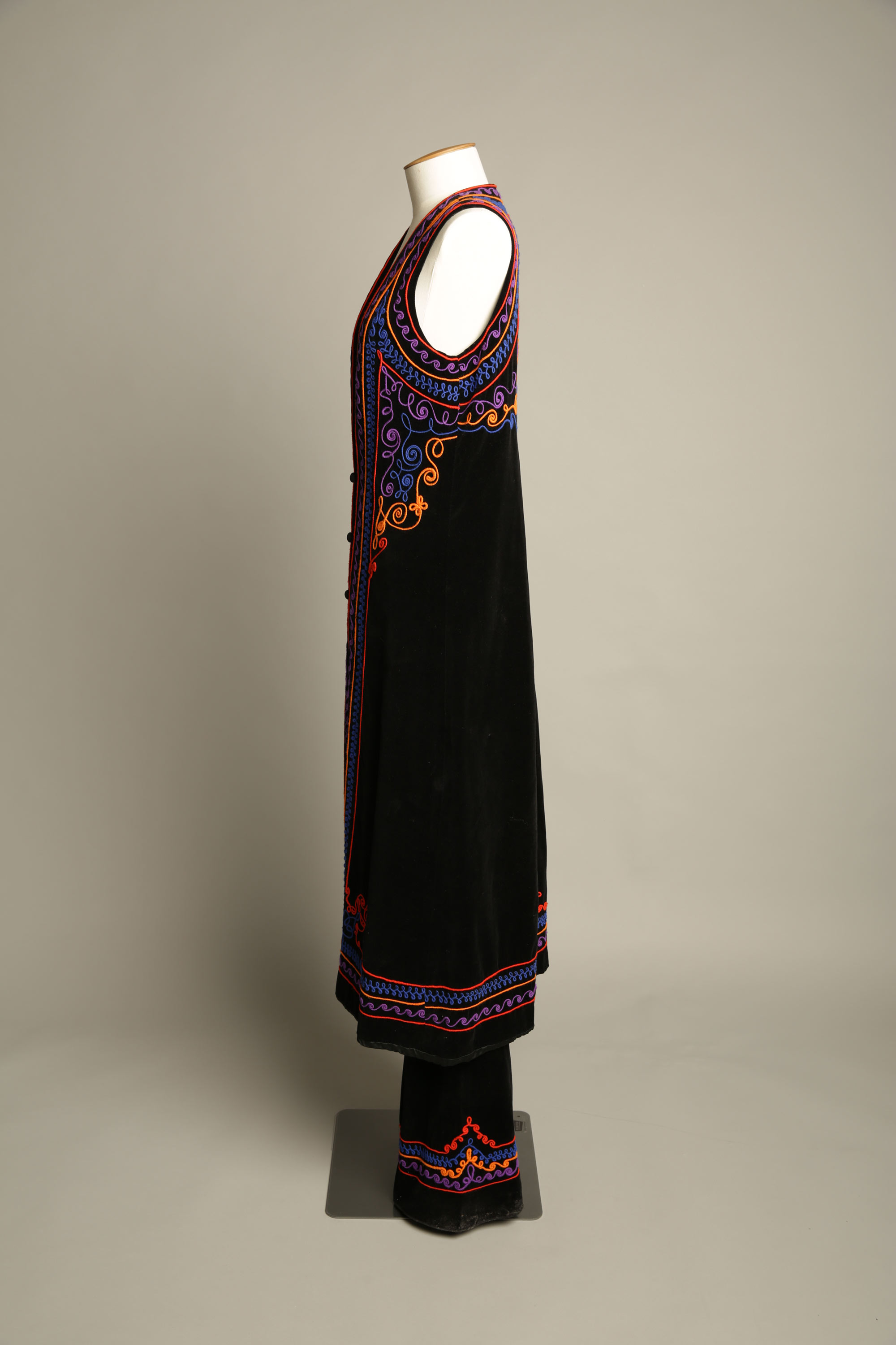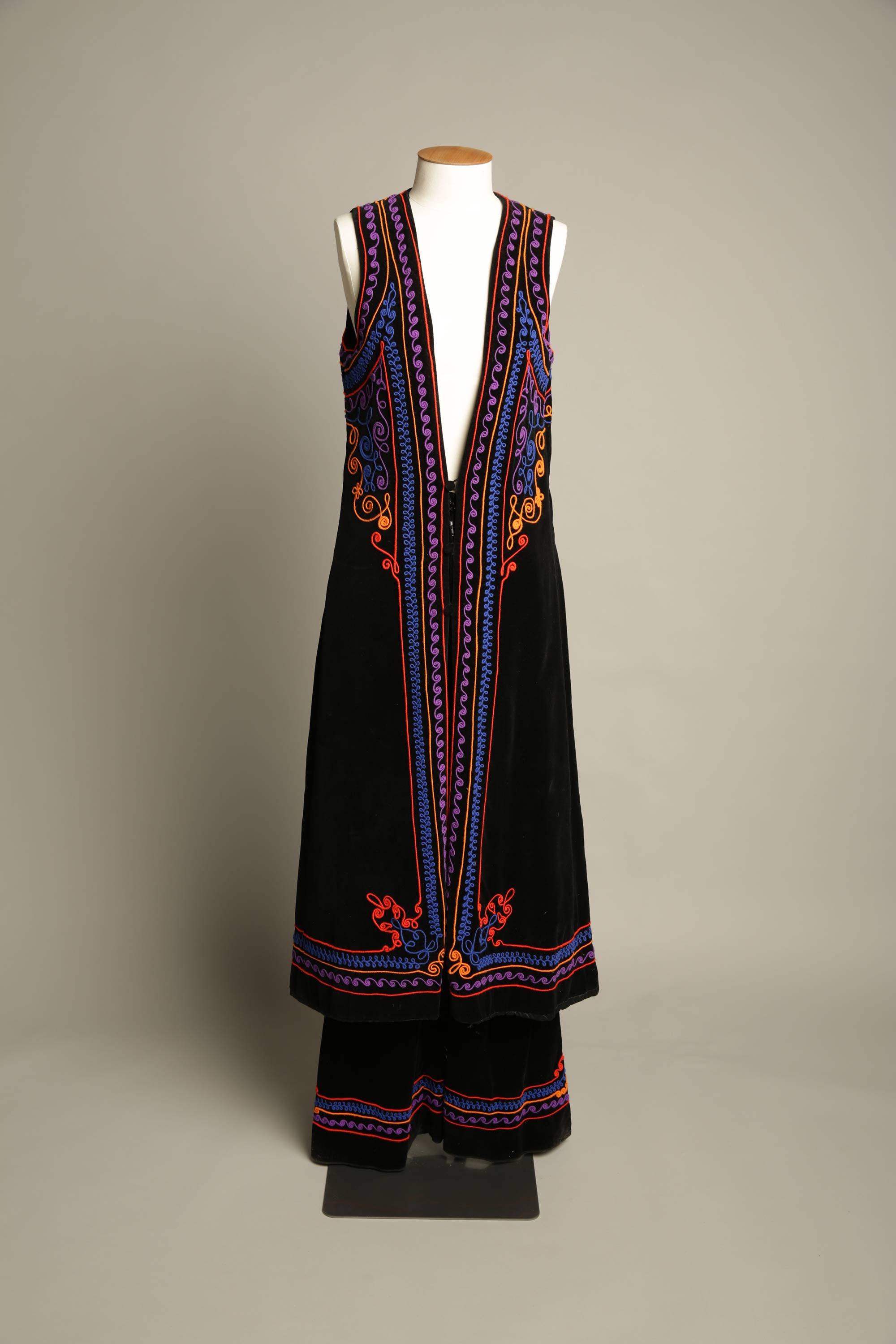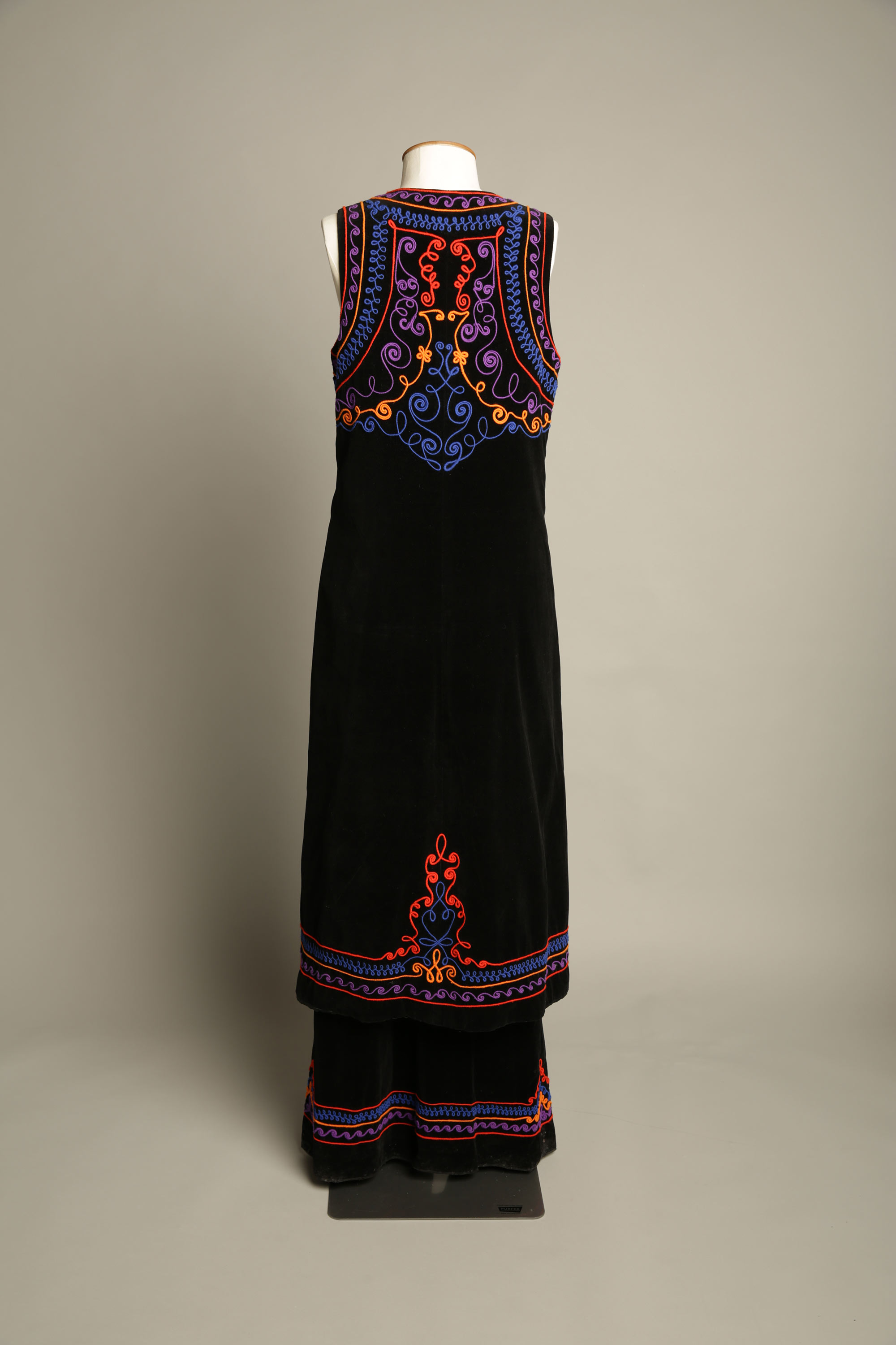 On her return to New Zealand in the late 1960s, Annie Bonza established a reputation for her distinctive braid 'doodling' and writing on garments. She developed a signature style based on a technique she had become fascinated in many years earlier. "When I worked at Chadwick and Bray they had all these pre-war patterns of cornelli designs. These intrigued me, and I was able to stay behind after work and play. But I could never get the hang of doing cornelli so I substituted with braid."