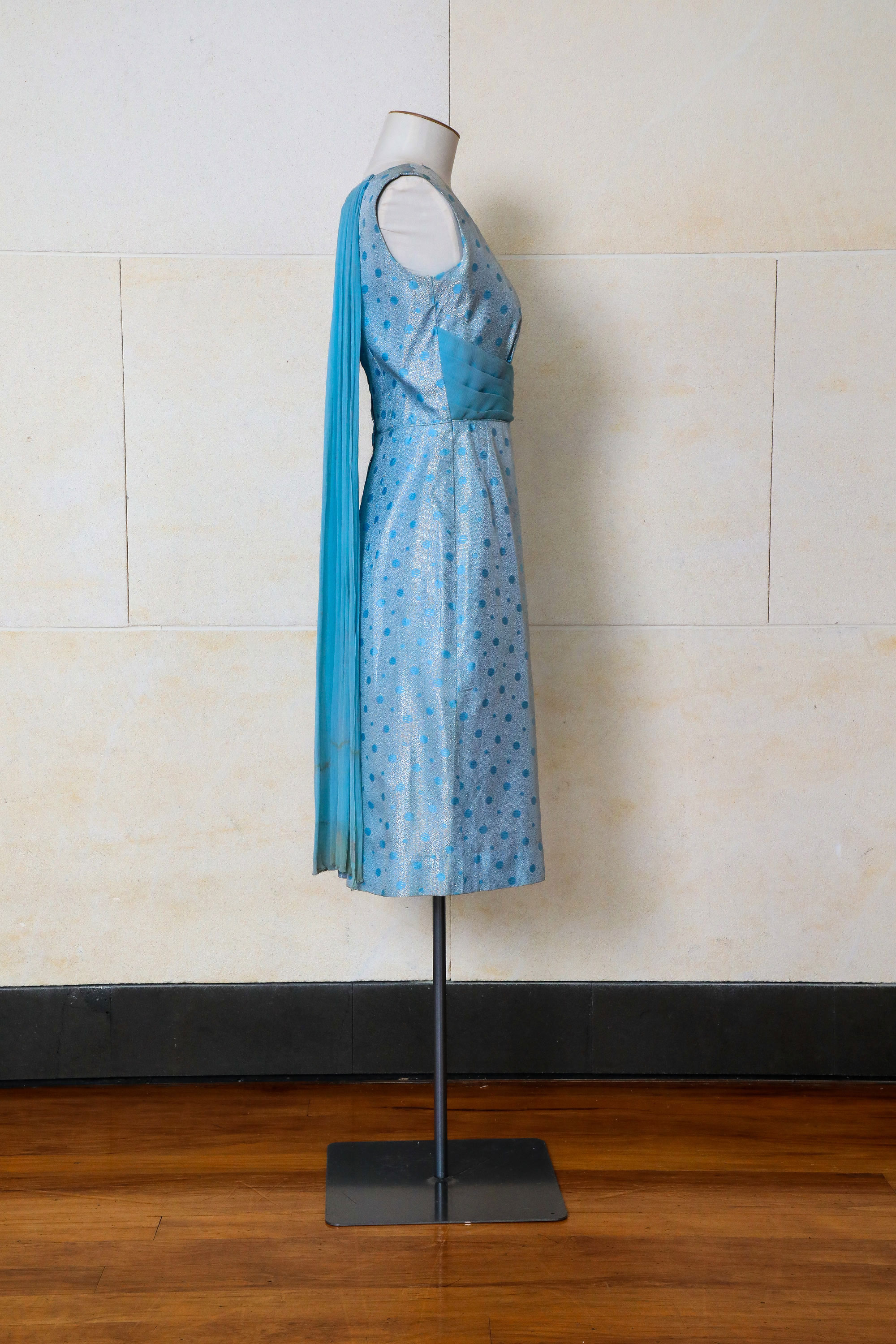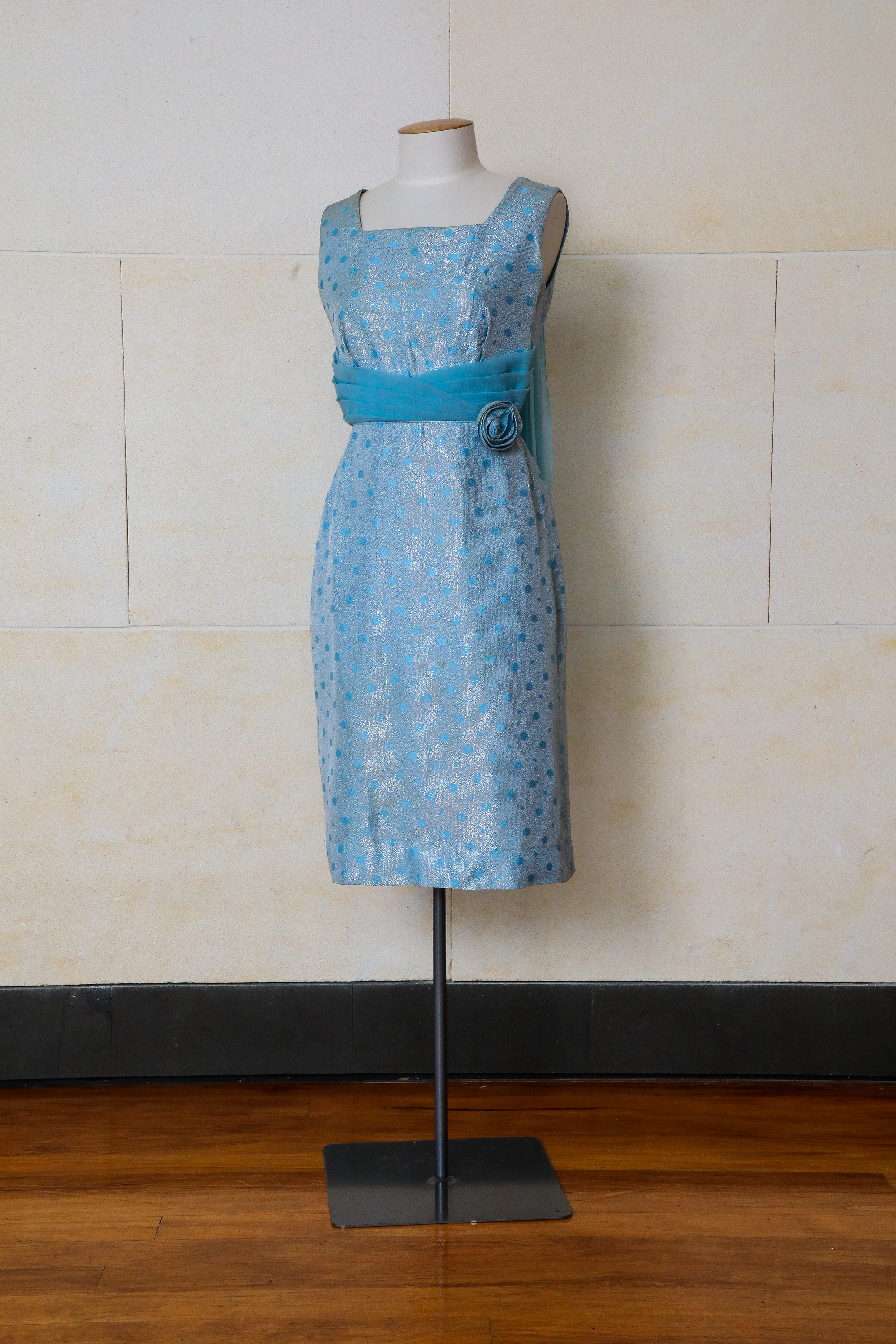 The dress has machine embroidered polka dots and the waist seam is piped. It has a train, swathed midriff section and a handmade fabric rose.