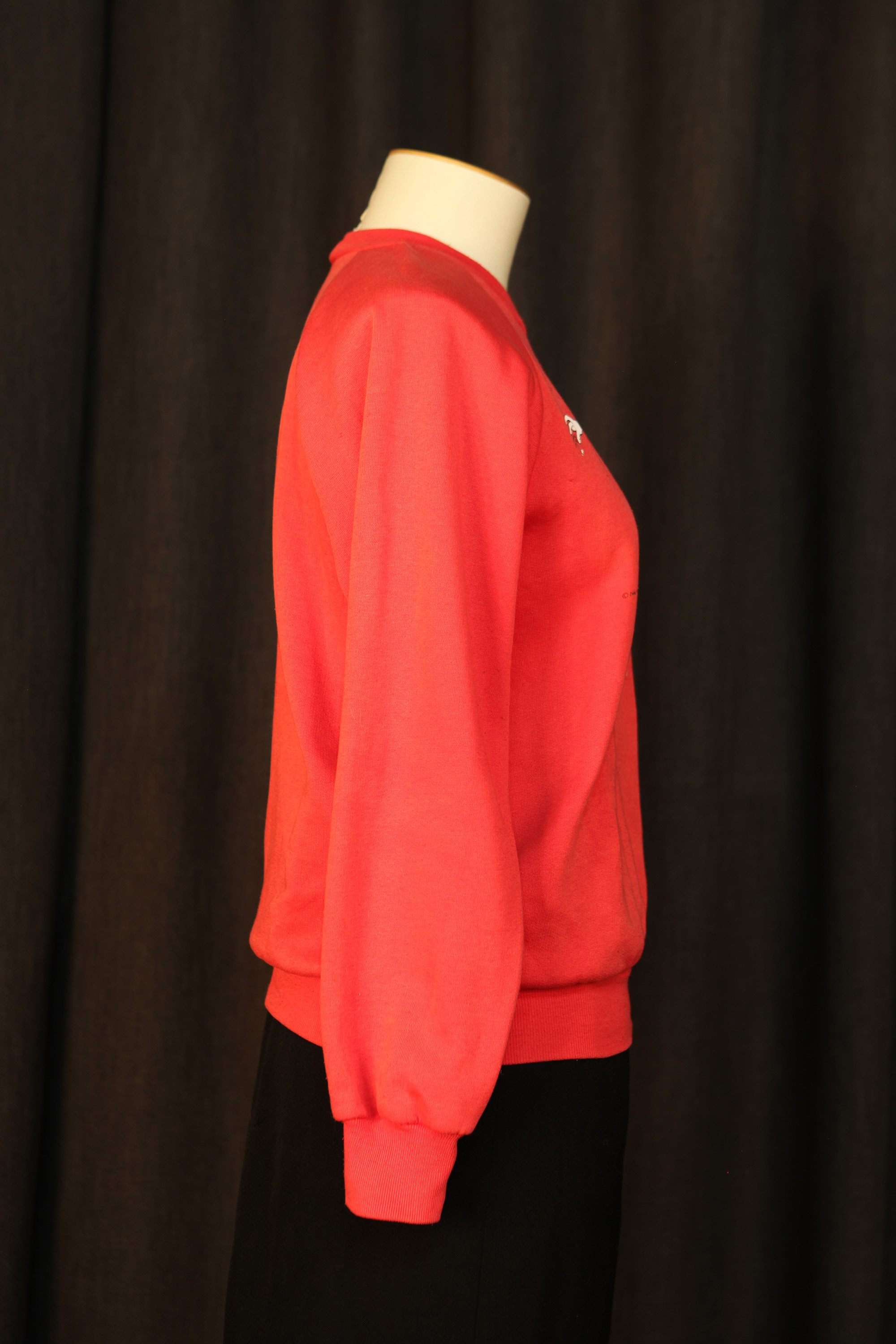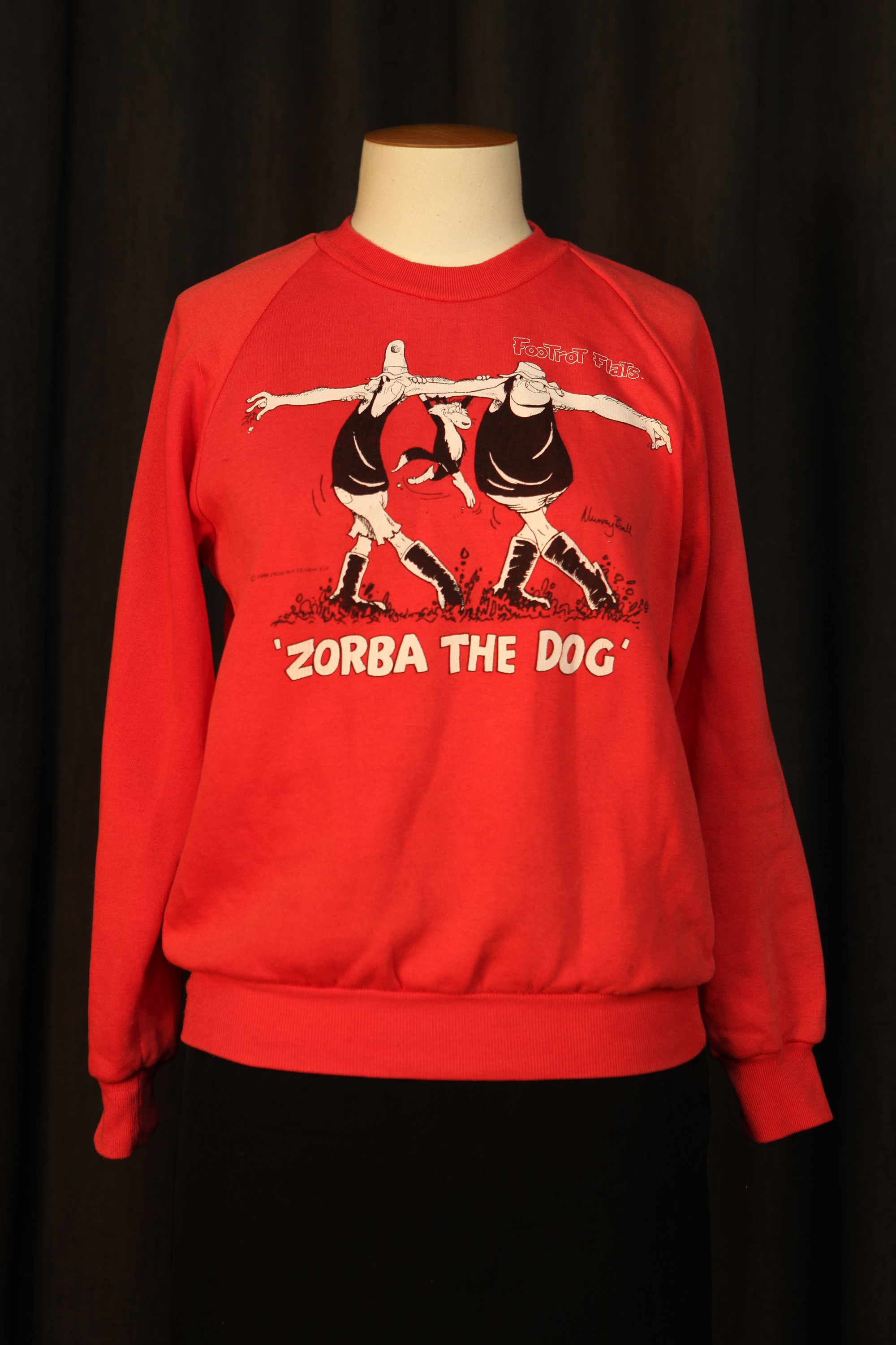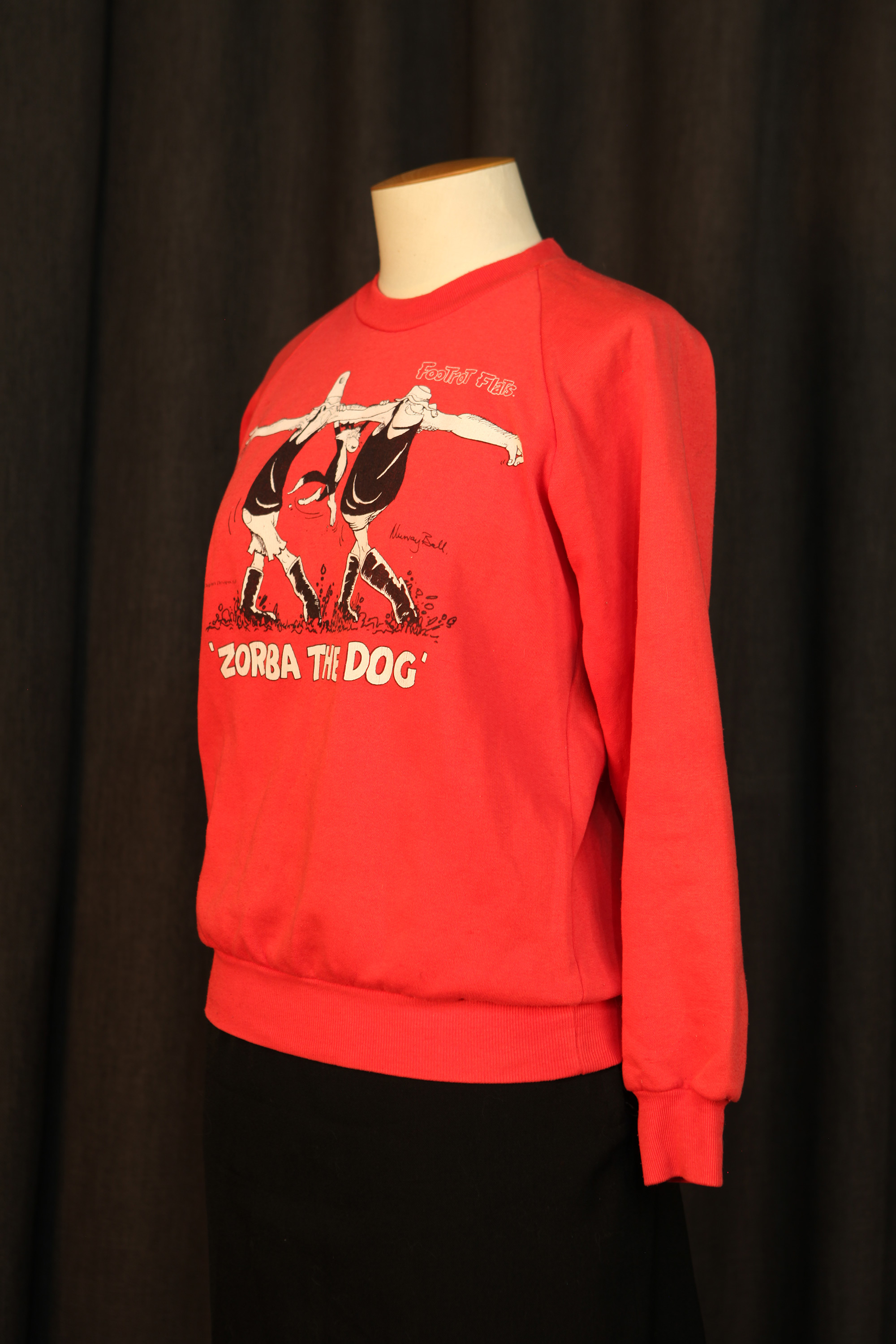Sheryl Morgan bought this 'Footrot Flats' sweatshirt from Wellington Airport in the mid 1980s. It was made by Tree. "I remember my sister being horrified at the price I paid, whatever it was. I haven't worn it for decades but I've hung on it because I think it's iconic 1980s New Zealand."