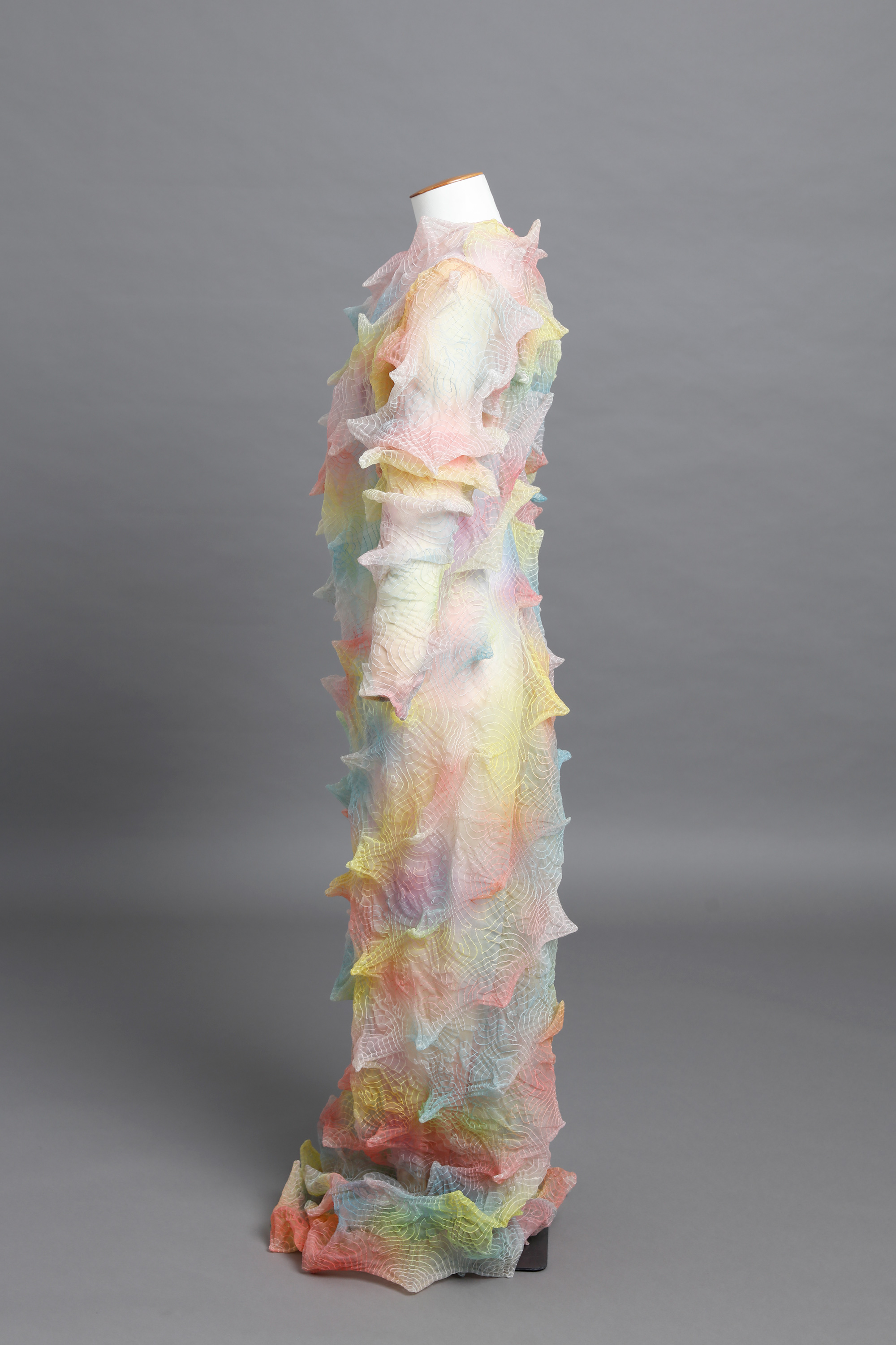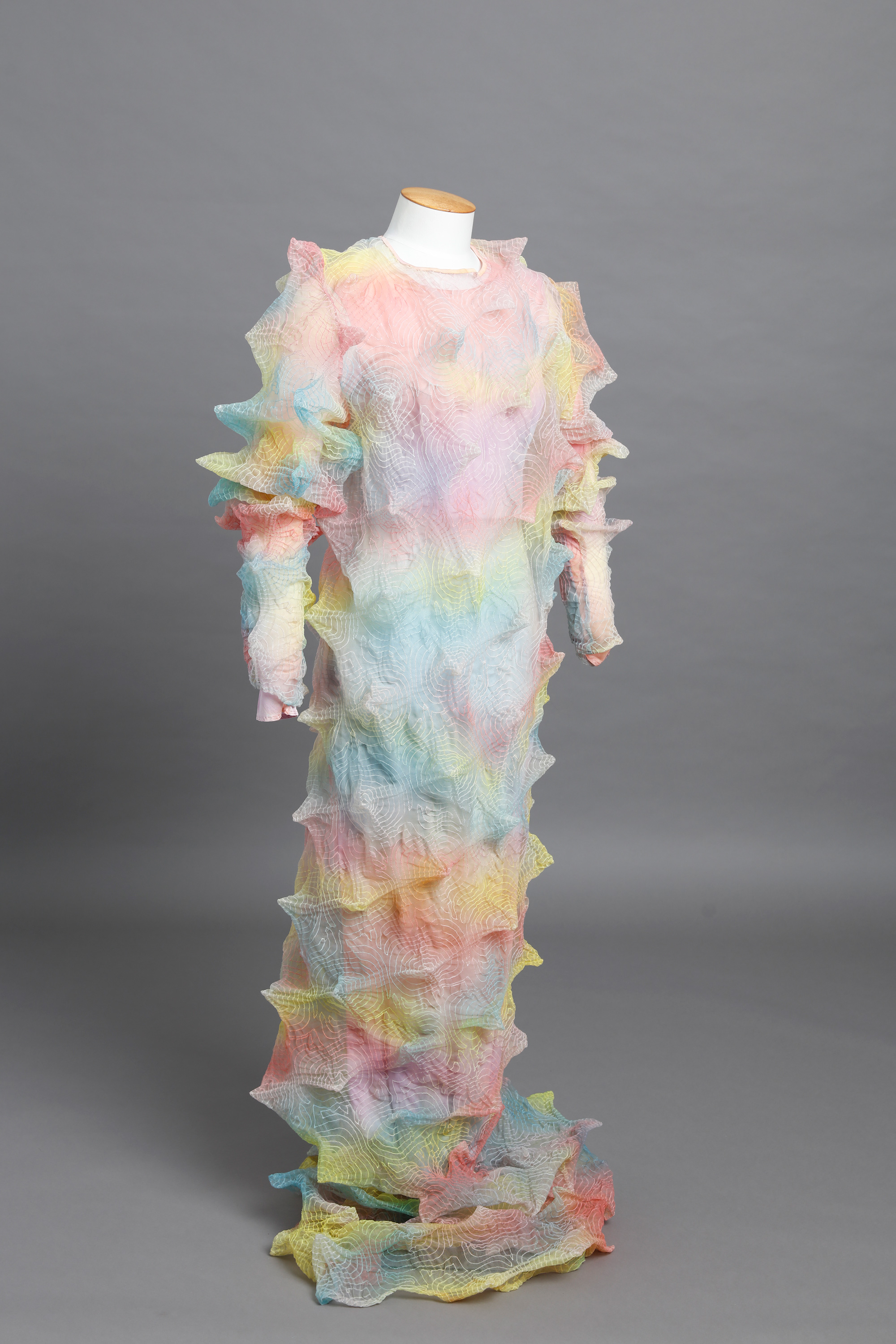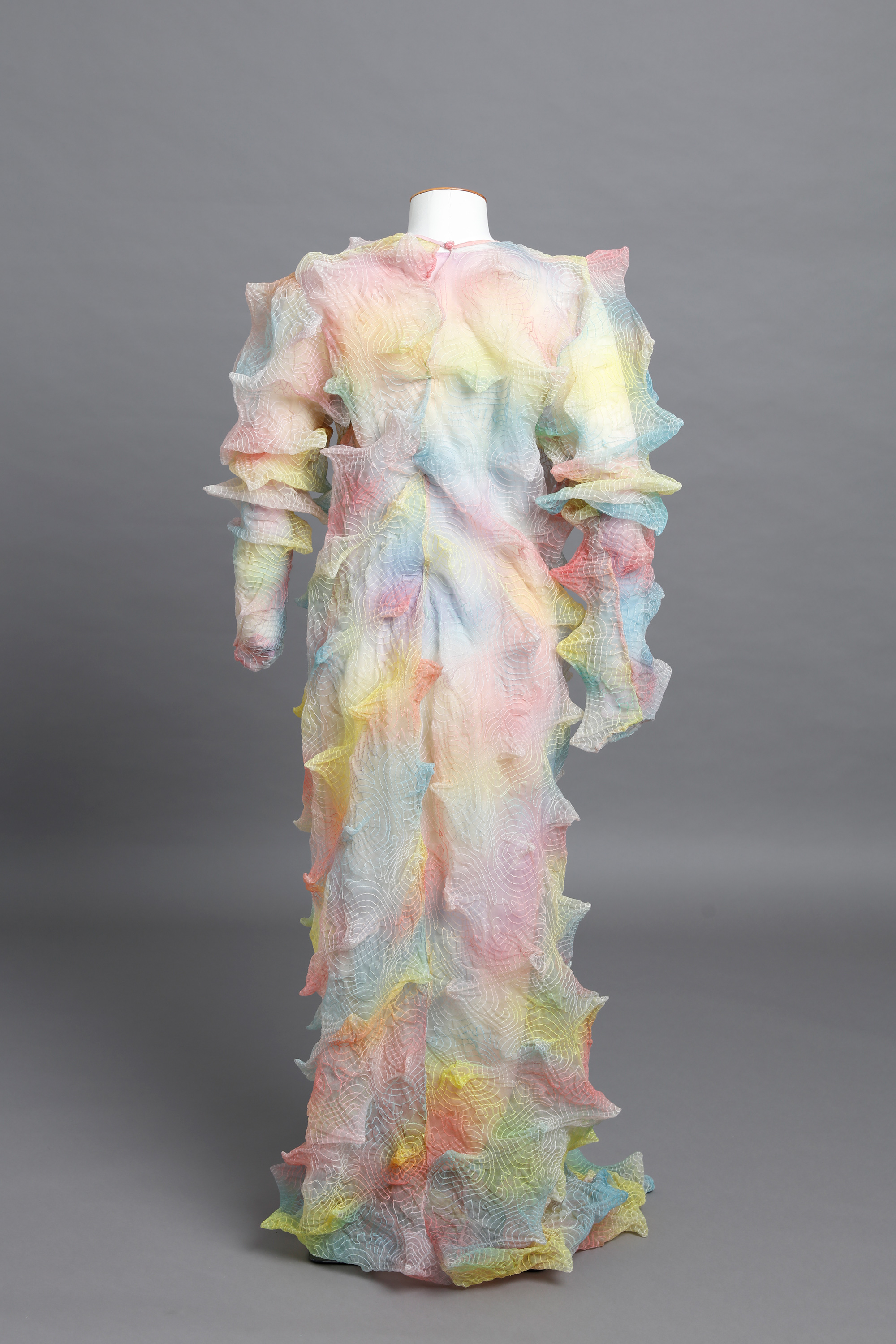 The sculptured nylon fabric came from New York. It was originally cream but has been dyed along with the matching silk jersey slip by Susan Holmes. Susan made this dress for Meegan Pollock to wear to a fundraising ball for Team New Zealand’s challenge for the America’s Cup in about 1988.