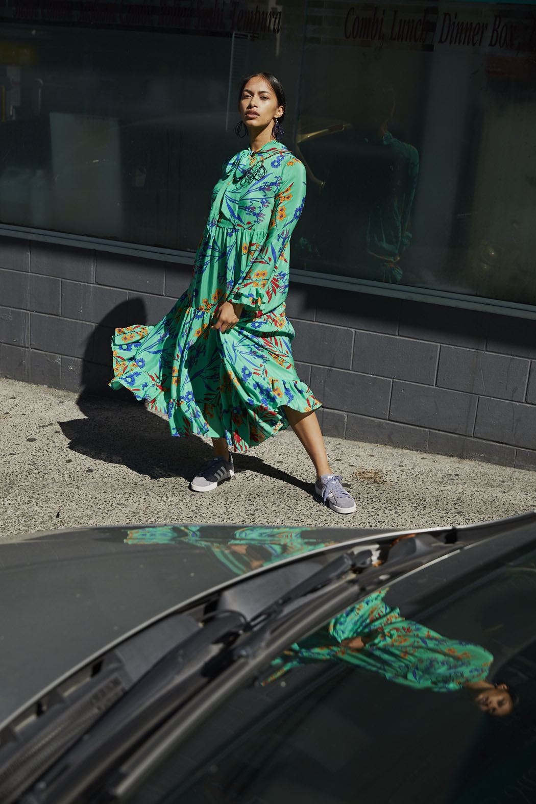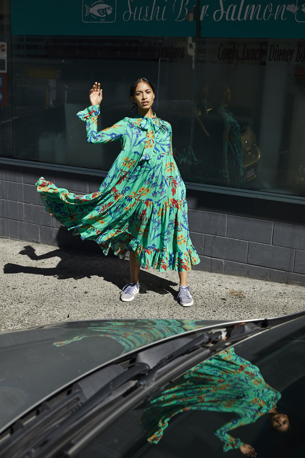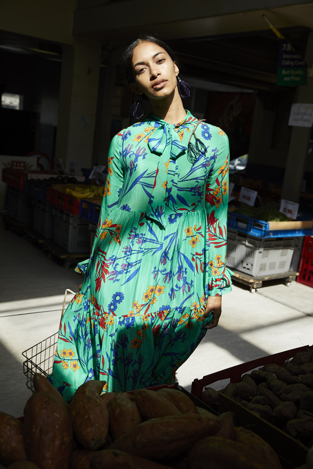 The romance and whimsy of a mu’umu’u dress is explored in this piece by Trelise Cooper, made with a tiered effect and ending with ruffles, featuring a simple necktie that draws together in a bow at the back of the dress.