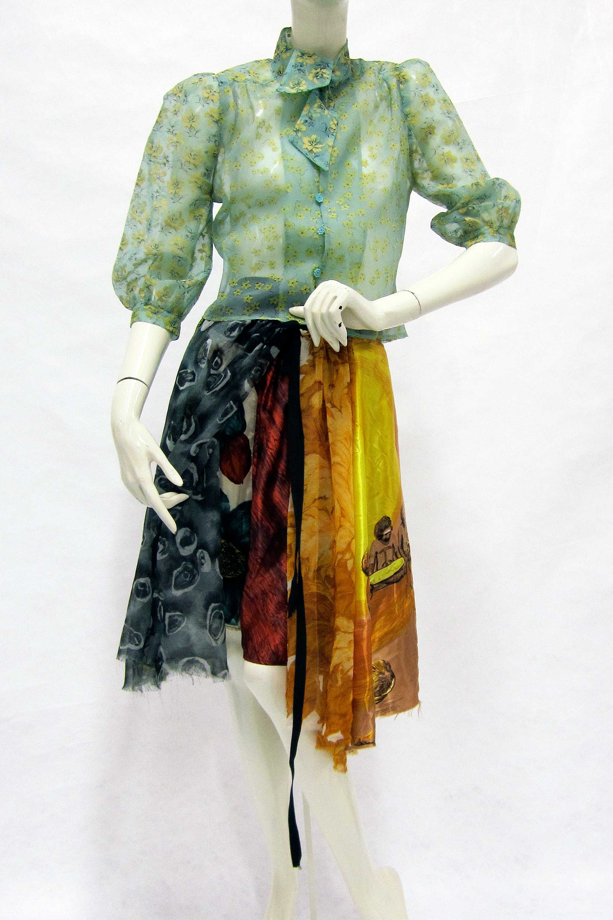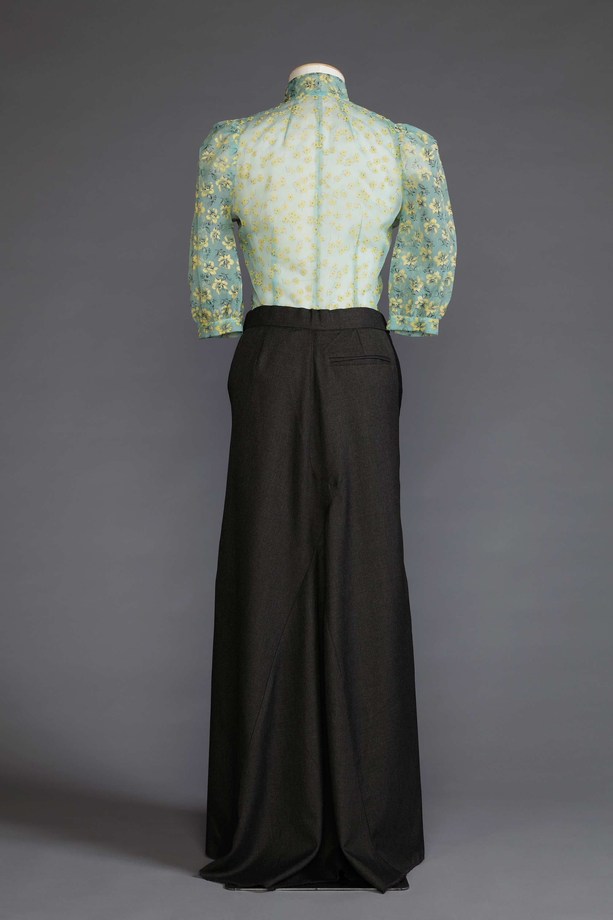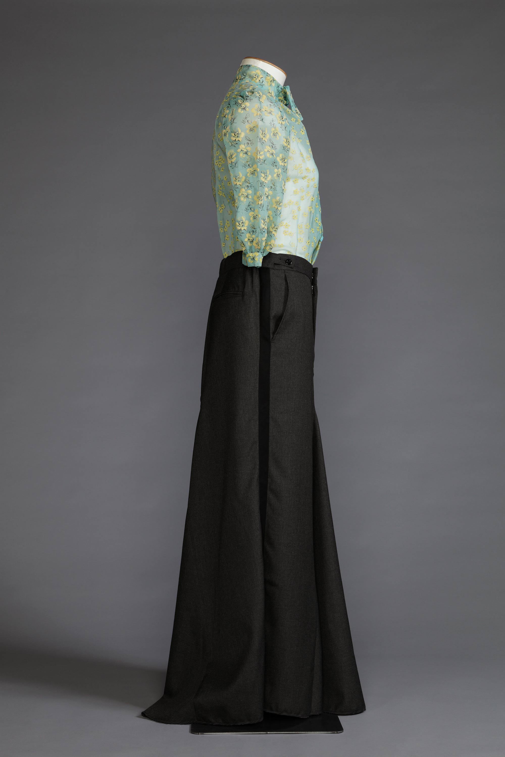 Margarita Robertson explains, "I’m still attracted to this type of fabric in op shops and vintage stores, pretty impractical, with its stiffness and nylon content. But I love it all the same!" She was taught to sew primarily by her mother, who had worked as a machinist in Dunedin’s clothing manufacturing industry. Employed in the Rank Xerox office at the time, Margarita found the two pieces of fabric she used for the blouse in her mother’s collection of old fabrics. The blouse is displayed with a NOM*d skirt made from boy’s school trousers. Reusing vintage garments and reinterpreting utilitarian clothing and uniforms in new and unexpected ways have become integral elements in NOM*d’s signature – timeless fashion that incorporates the past and applies new interpretation and vision to make it modern. Read more about the history of home sewing in the New Zealand Fashion Museum publication Home Sewn.
