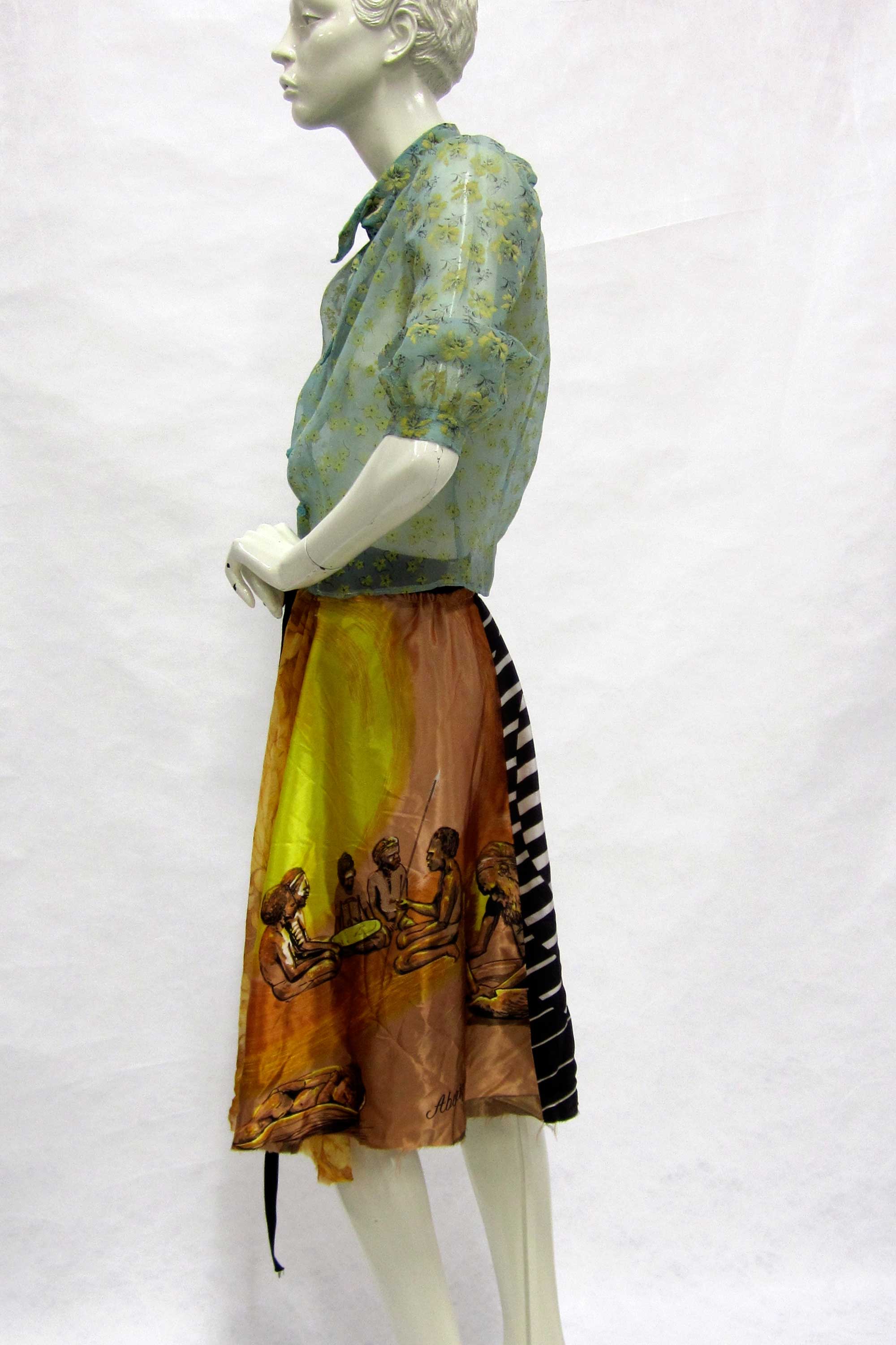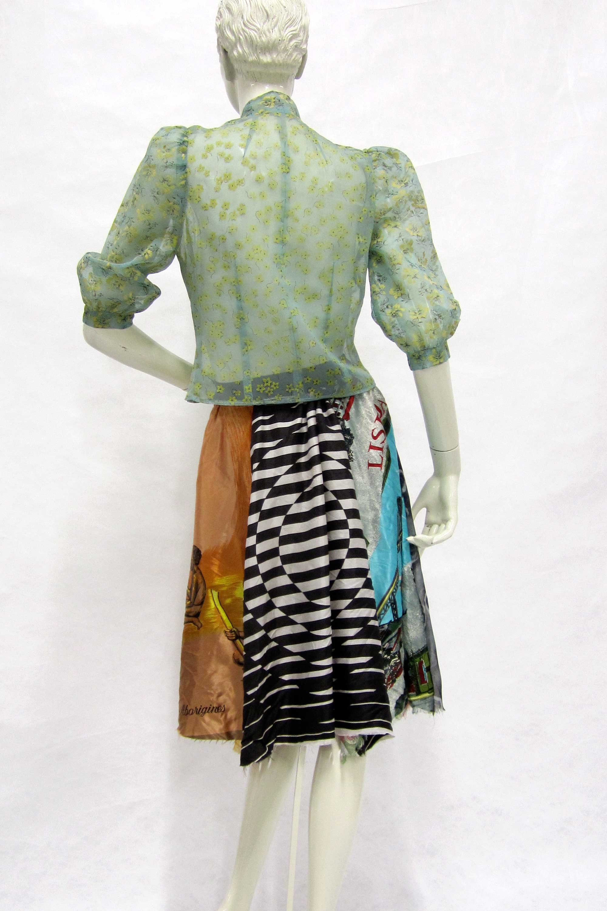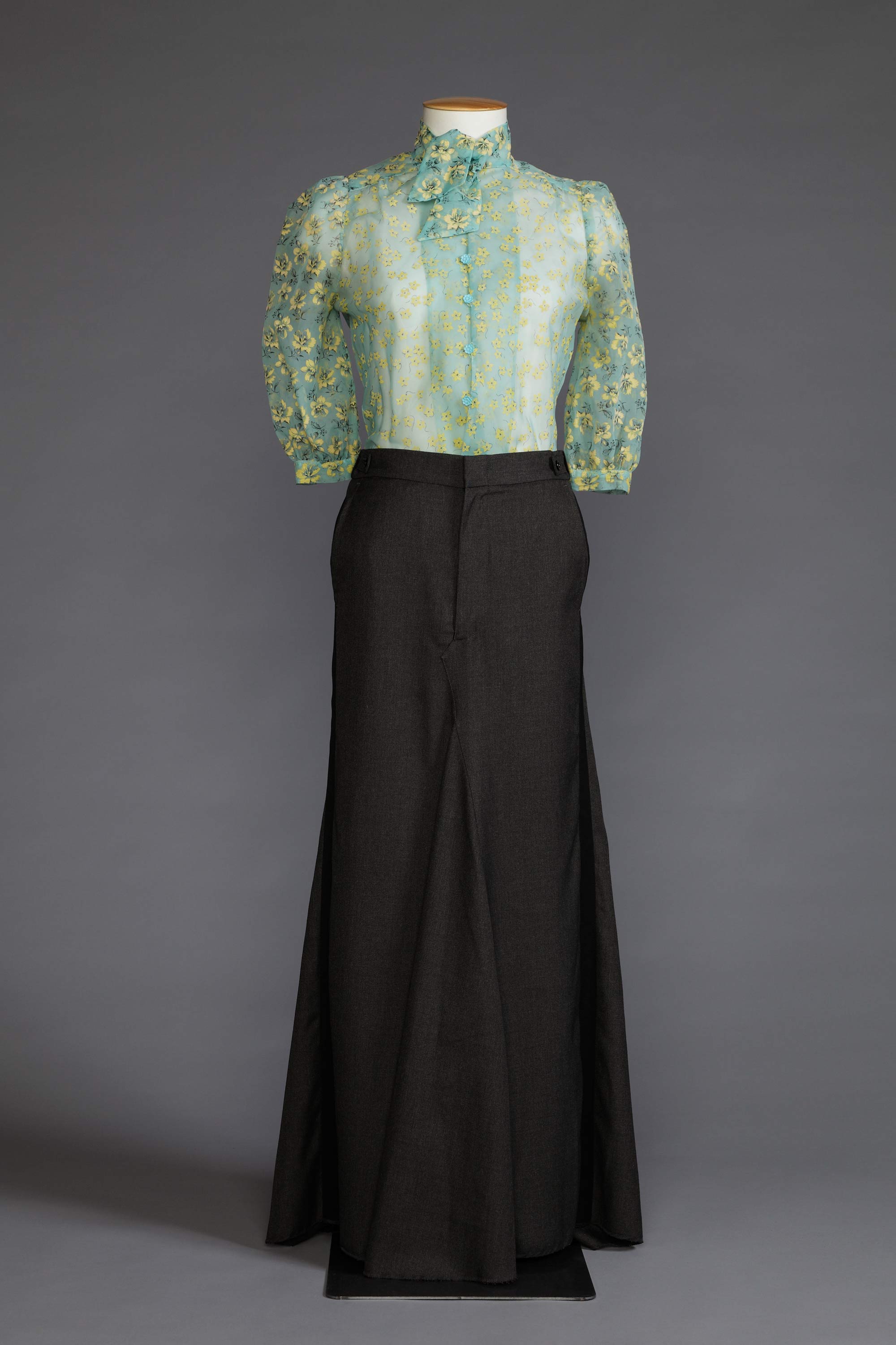 Margarita Robertson explains, "I’m still attracted to this type of fabric in op shops and vintage stores, pretty impractical, with its stiffness and nylon content. But I love it all the same!" She was taught to sew primarily by her mother, who had worked as a machinist in Dunedin’s clothing manufacturing industry. Employed in the Rank Xerox office at the time, Margarita found the two pieces of fabric she used for the blouse in her mother’s collection of old fabrics. The blouse is displayed with a NOM*d skirt made from boy’s school trousers. Reusing vintage garments and reinterpreting utilitarian clothing and uniforms in new and unexpected ways have become integral elements in NOM*d’s signature – timeless fashion that incorporates the past and applies new interpretation and vision to make it modern. Read more about the history of home sewing in the New Zealand Fashion Museum publication Home Sewn.