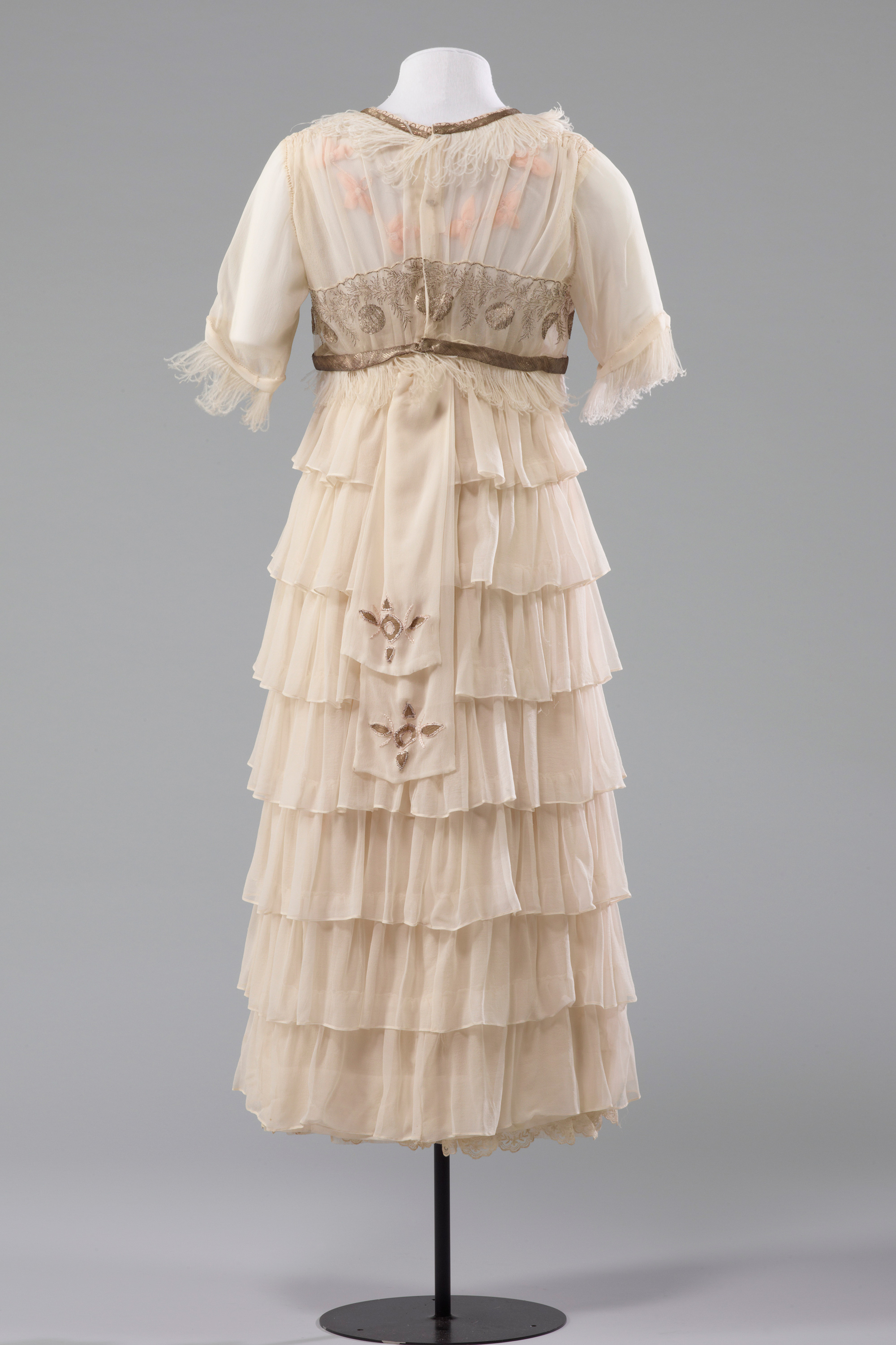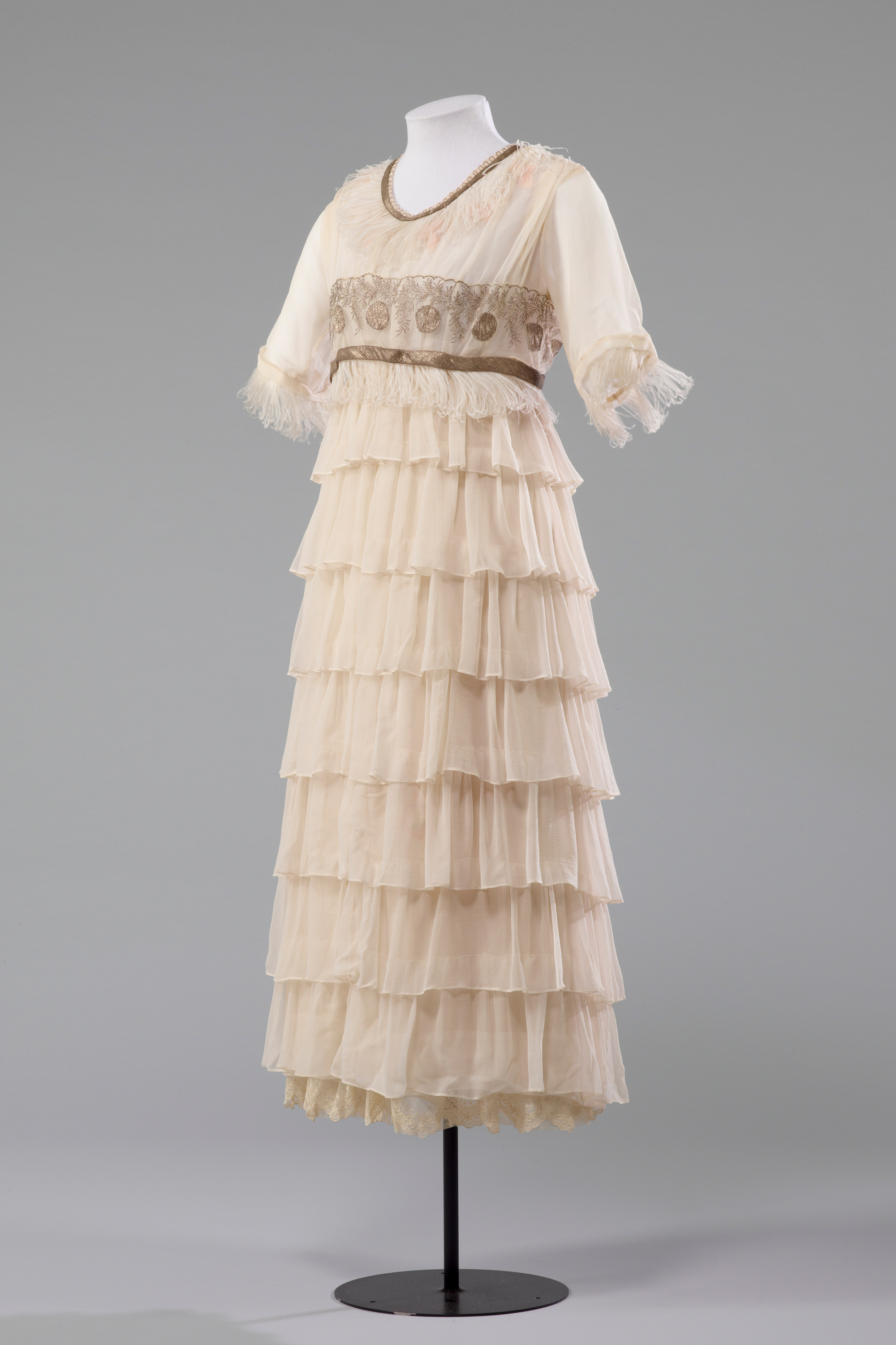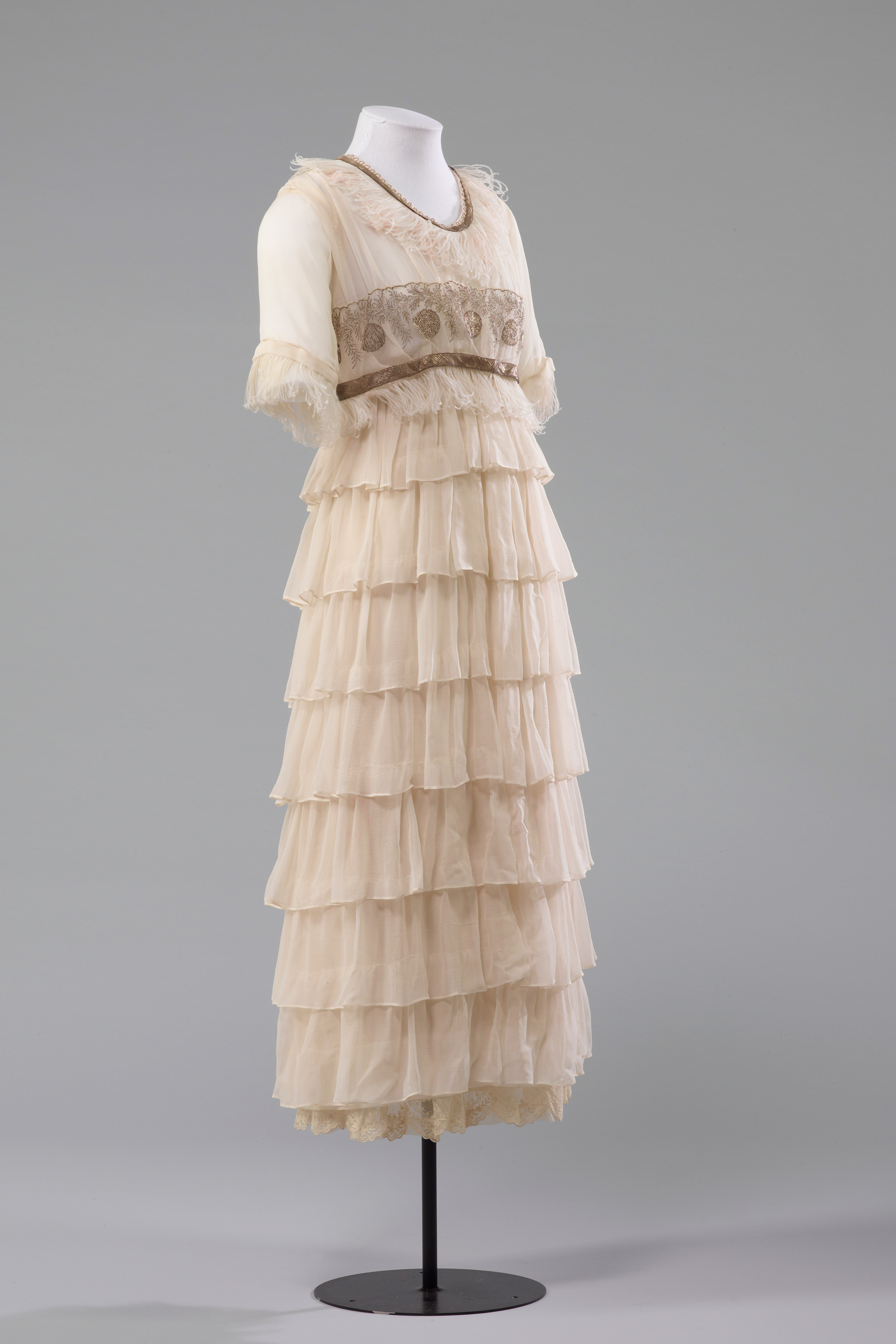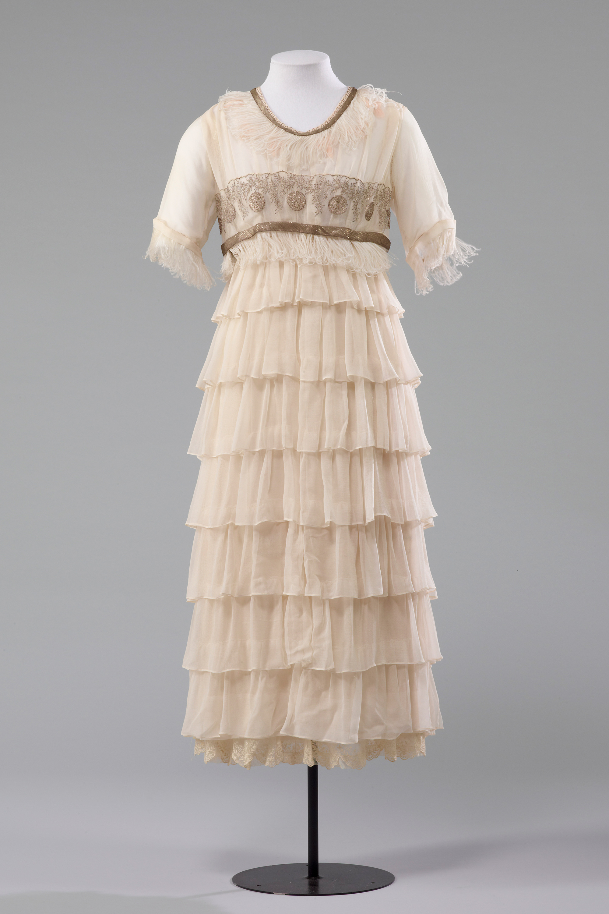 This wedding dress was made-to-measure at The DSA (Drapery Supply Association), a major Dunedin department store. It was worn by Tui McKinnon for her wedding to Harold Mein Preston on 9 June 1920. The dress features a high Empire waist and tiers of ruffled georgette. The dress is decorated with embroidered netting, metallic ribbon and white ostrich plumes.