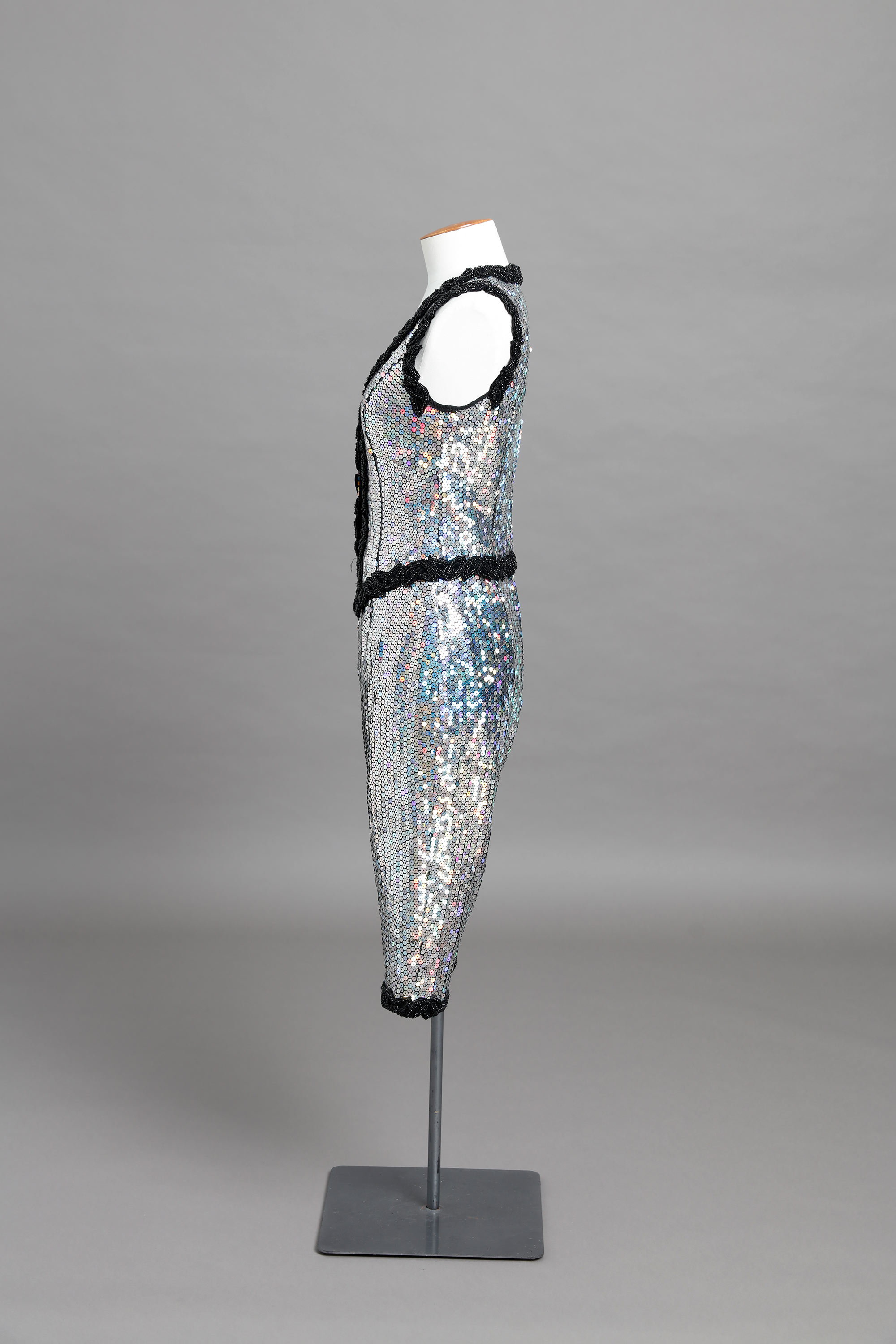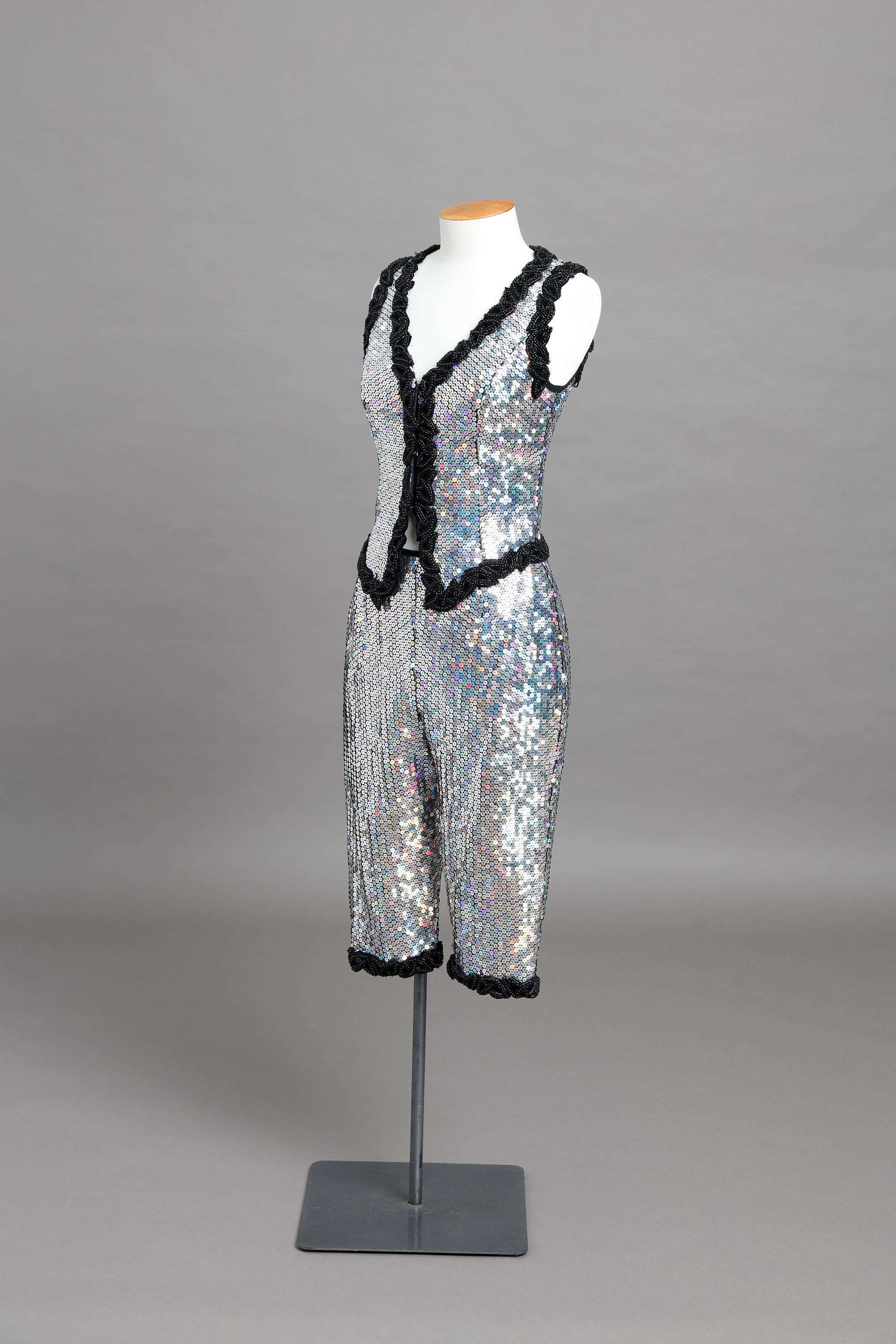 The vest and knickerbockers are edged with black beading.