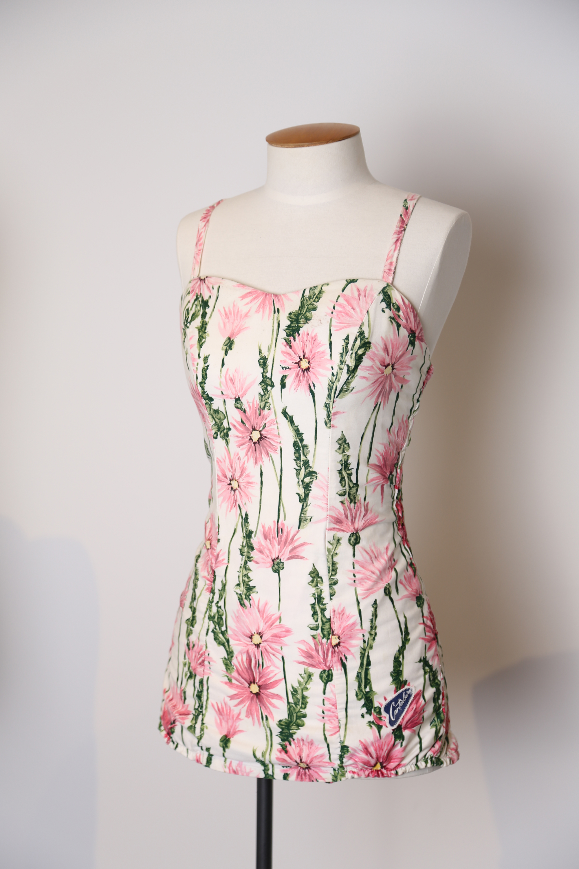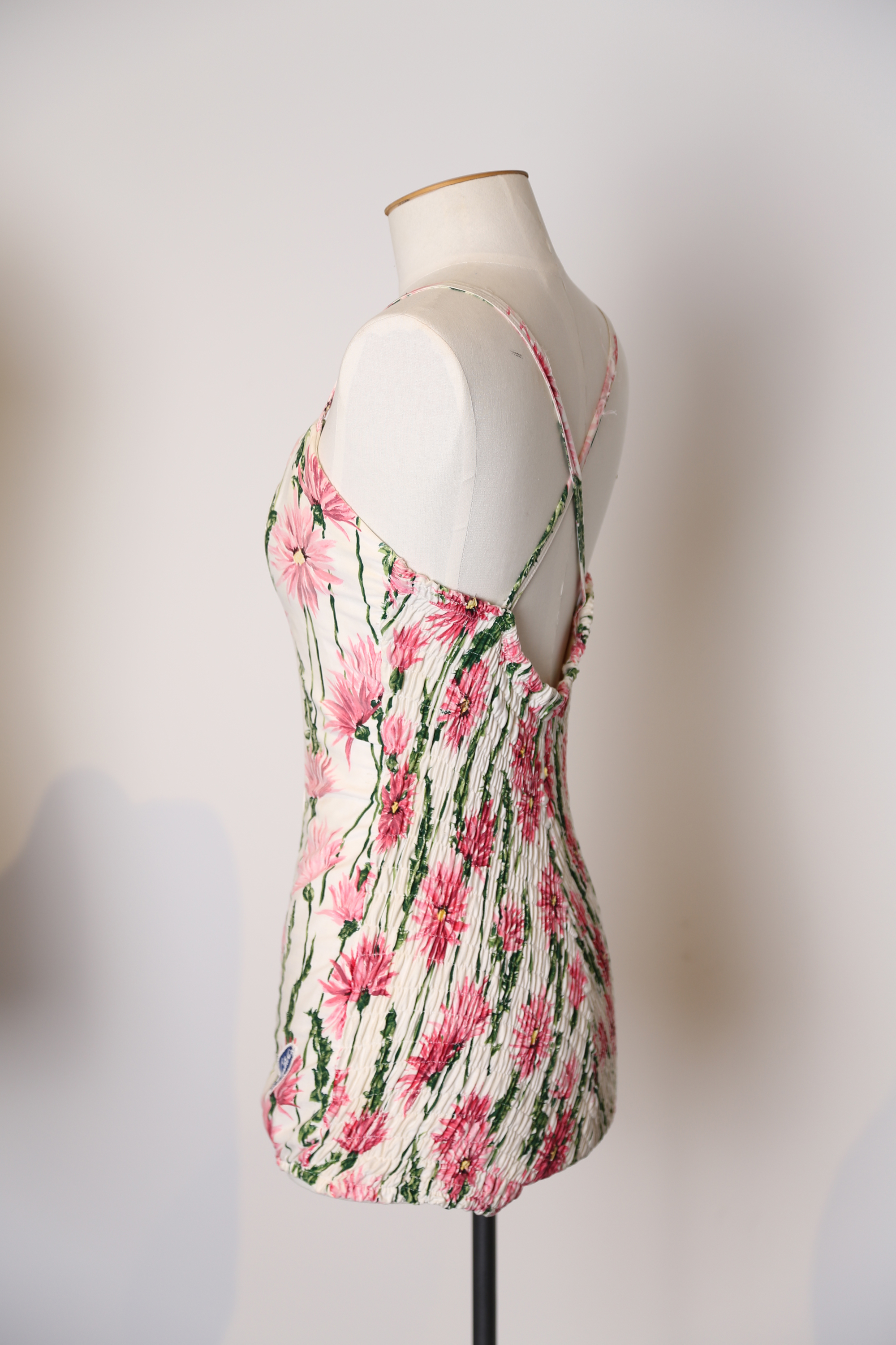 This Canterbury swimsuit was bought by Molly Hall in Whakatane in 1960 when she first came to New Zealand and lived on Ohope Beach. It was a bargain, she said, and it replaced the blue and cream one that she had brought over from the UK. It was one of only two swimsuits she ever owned. Molly wore it for the rest of her life, it lasted so well. "There are heaps of photos of Mum in this suit looking very glamorous," said Molly's daughter Sandy. "Her favourite thing was to paddle, and she would always wear this suit even to paddle in, offset with a white large brim sunhat with pink flowers. She used to swim daily when she was pregnant with me in 1960 - the shirring allowed it to stretch. It only started to give as her own body did in her 70s. It was our joke that the shirring was giving out in sympathy with her skin." Molly's granddaughter, Samara Pepperell, replaced the shirring elastic.