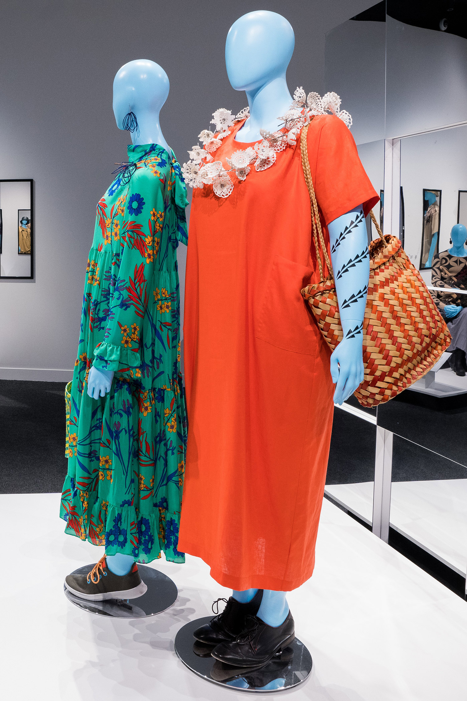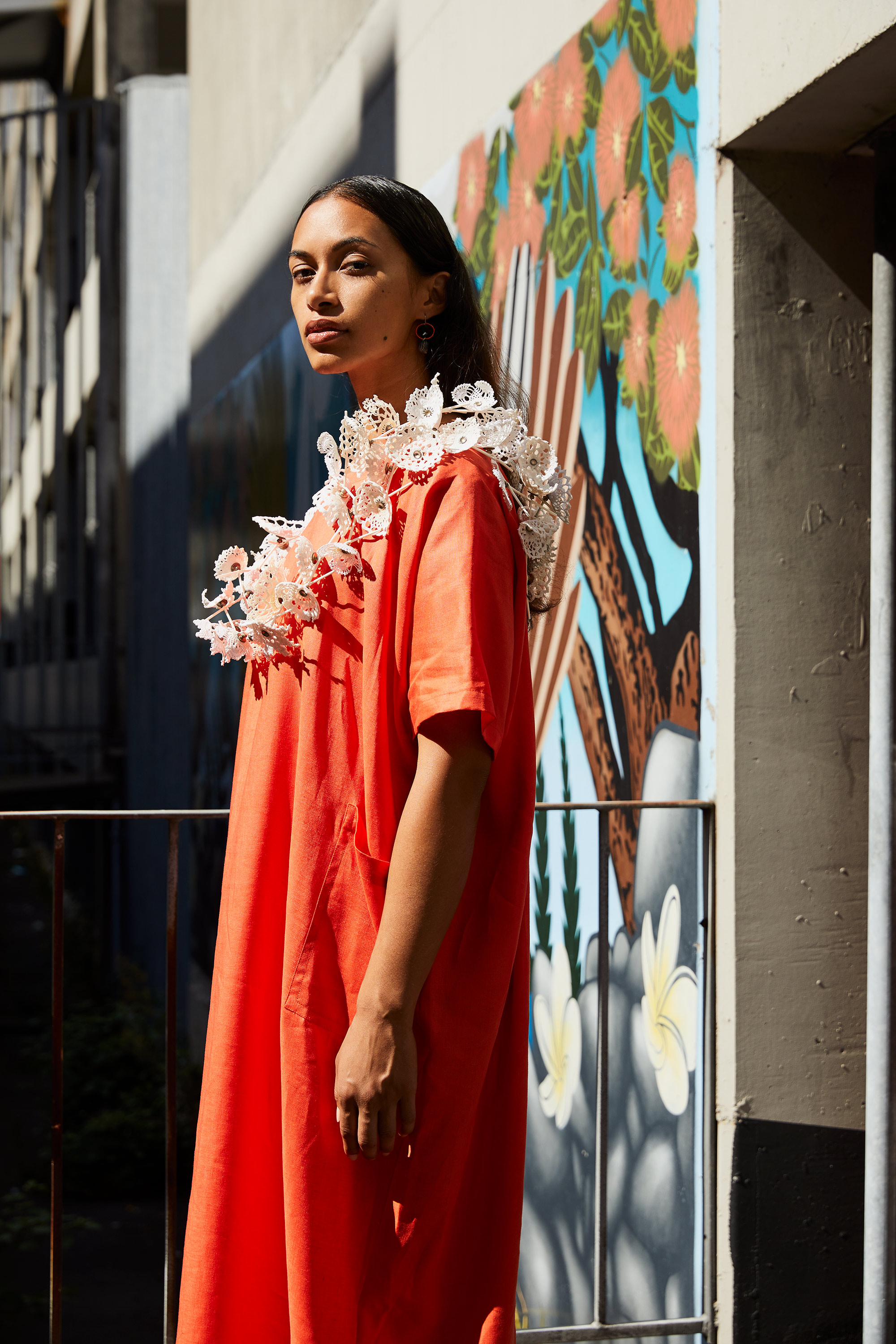 This 'Mama' dress by Auckland label Papa Clothing is a one-size, genderless, minimalist take on the classic mu’umu’u (audio description below). A staple item for the label, it is named after designer Keva Rand’s own mother. "This shape is her favourite and looks so beautiful on her." The lei - the Doily Daisy Chain is made by Fran Allison.
