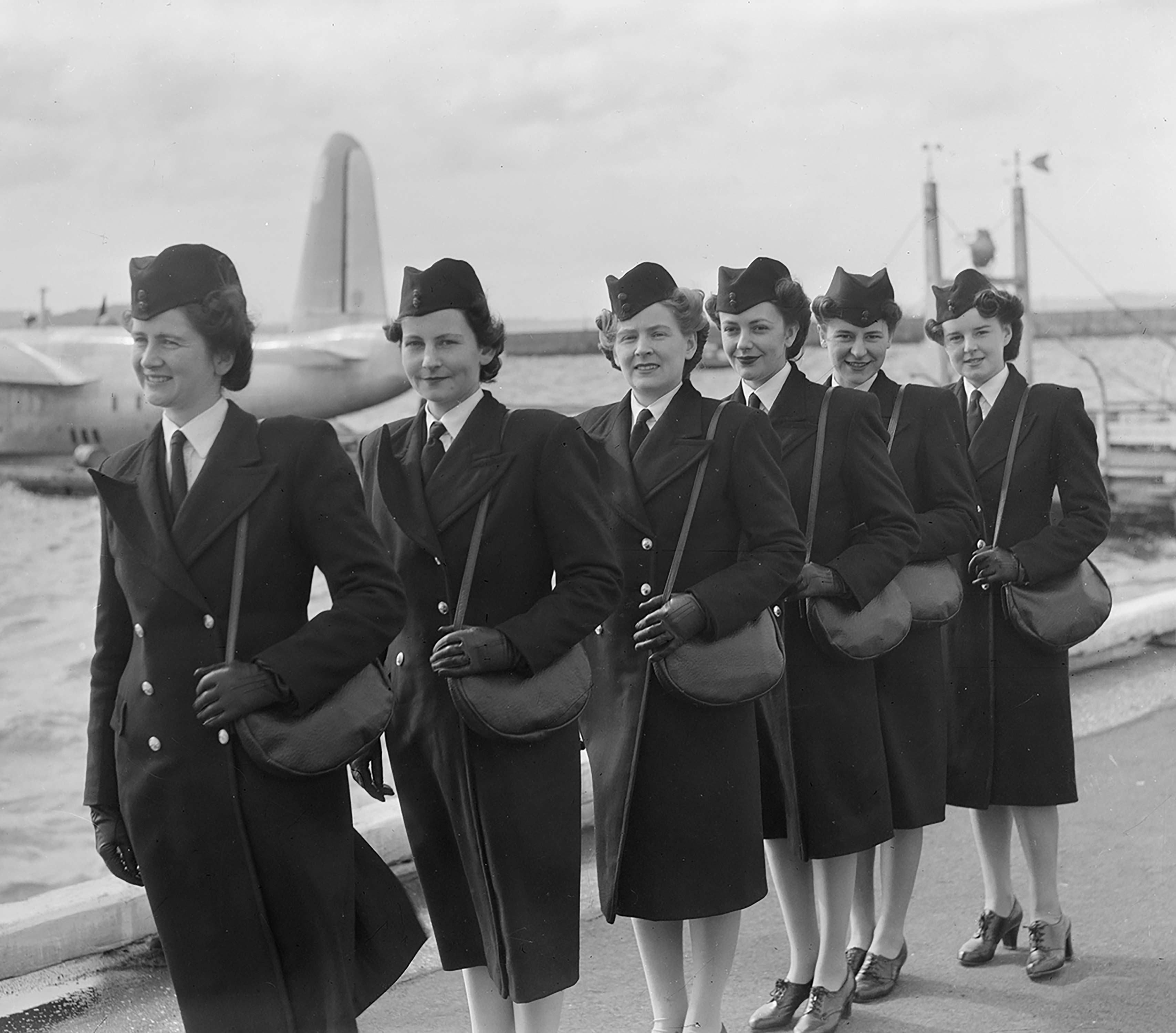 Initially TEAL employed male stewards due to the requirements of the job that included the handling of heavy cargo and sometimes passengers to and from the flying boats. However in 1946, the first six stewardesses were chosen from 3,000 applicants. In these early days they had to be unmarried. A reflection of the time meant stewardesses left the role when they became married. Passengers' safety was always a large part of their duties and the uniform represented authority. Influenced by the still-recent world war they were made in military style with single breasted jackets with adorned with gold buttons. There was also a square-shouldered double breasted overcoat with gold buttons. The stewardesses wore a half wing metal badge with a TA (Tasman Airways) emblem. Epaulets appeared on the single breasted jacket – the one bar referring to junior rank. They wore a man-styled white shirt with black tie and Glengarry hat with two buttons on the centre front. Black leather gloves, a black leather handbag and black laced-and-heeled court shoes were also part of the full uniform worn when on the ground.