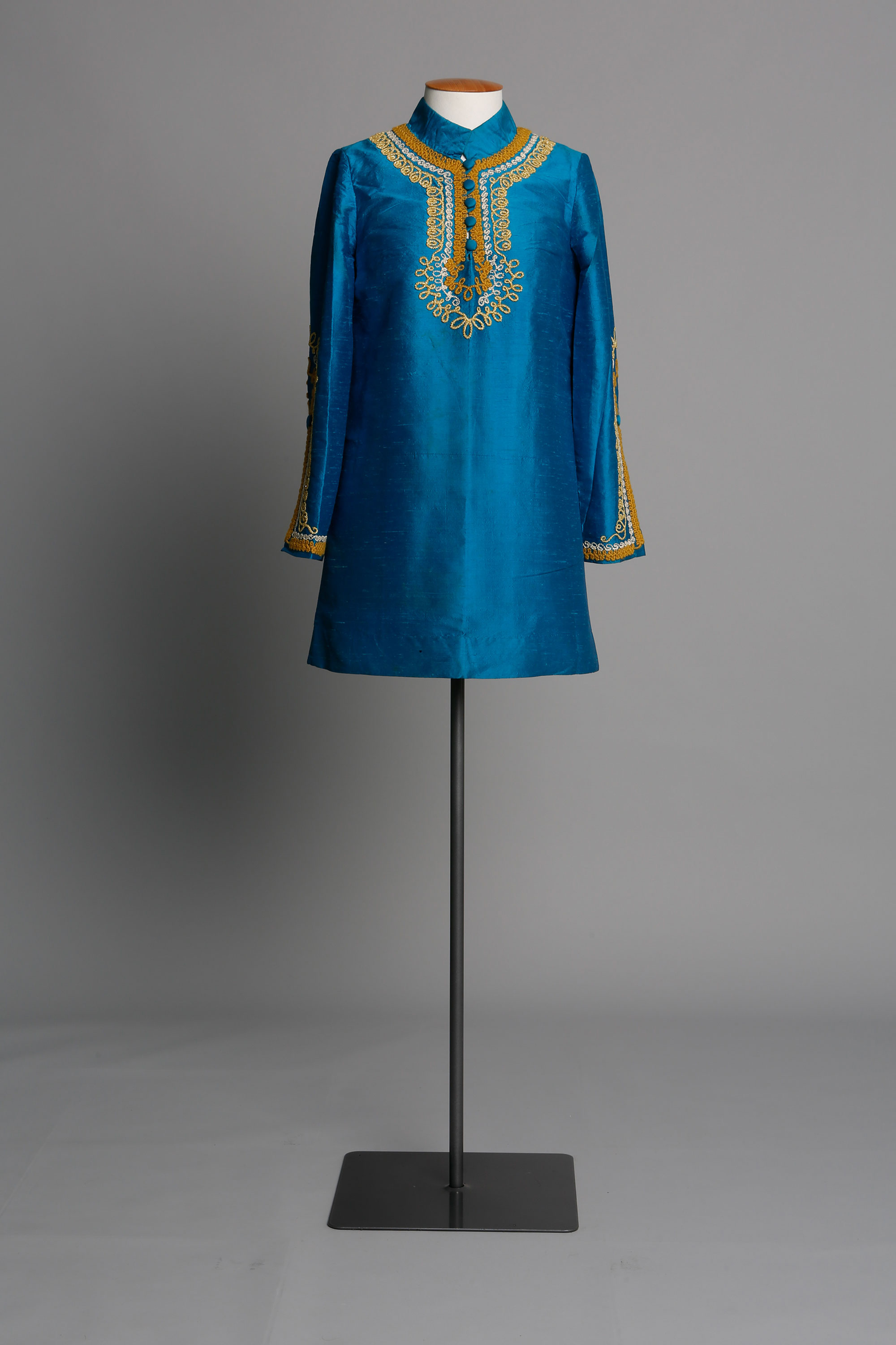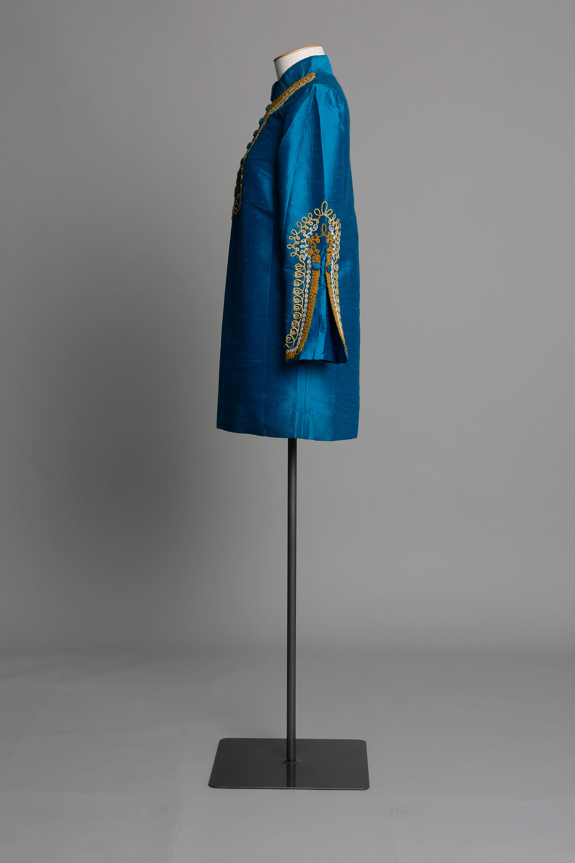 Enid Eiriksson was married in a Christchurch registry office in a blue Thai silk dress designed by Annie Bonza. Enid met Annie through Murray Grimsdale, a friend from Ilam Art School, who was living with Annie at the time. This dress was specially commissioned for Enid's wedding.
