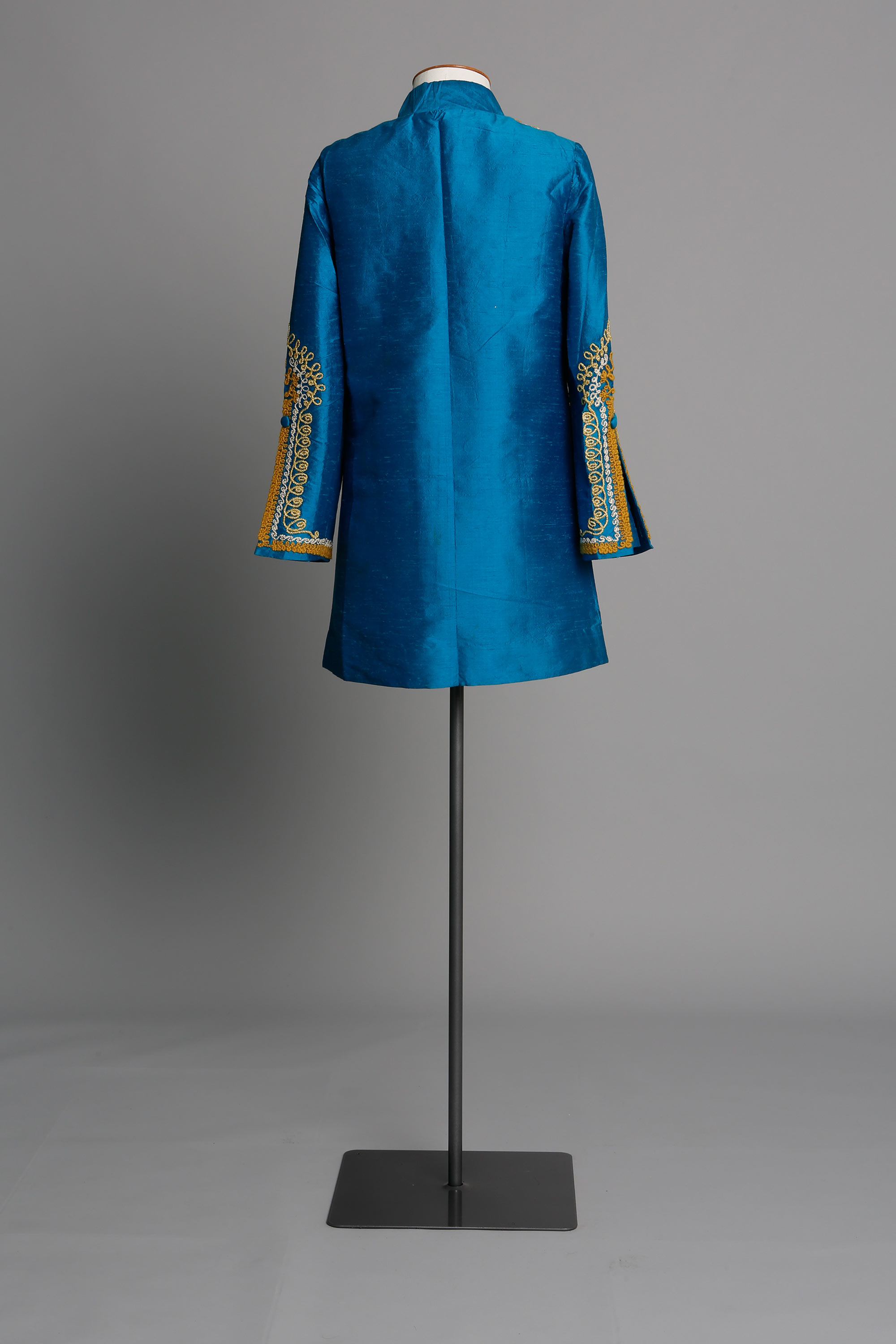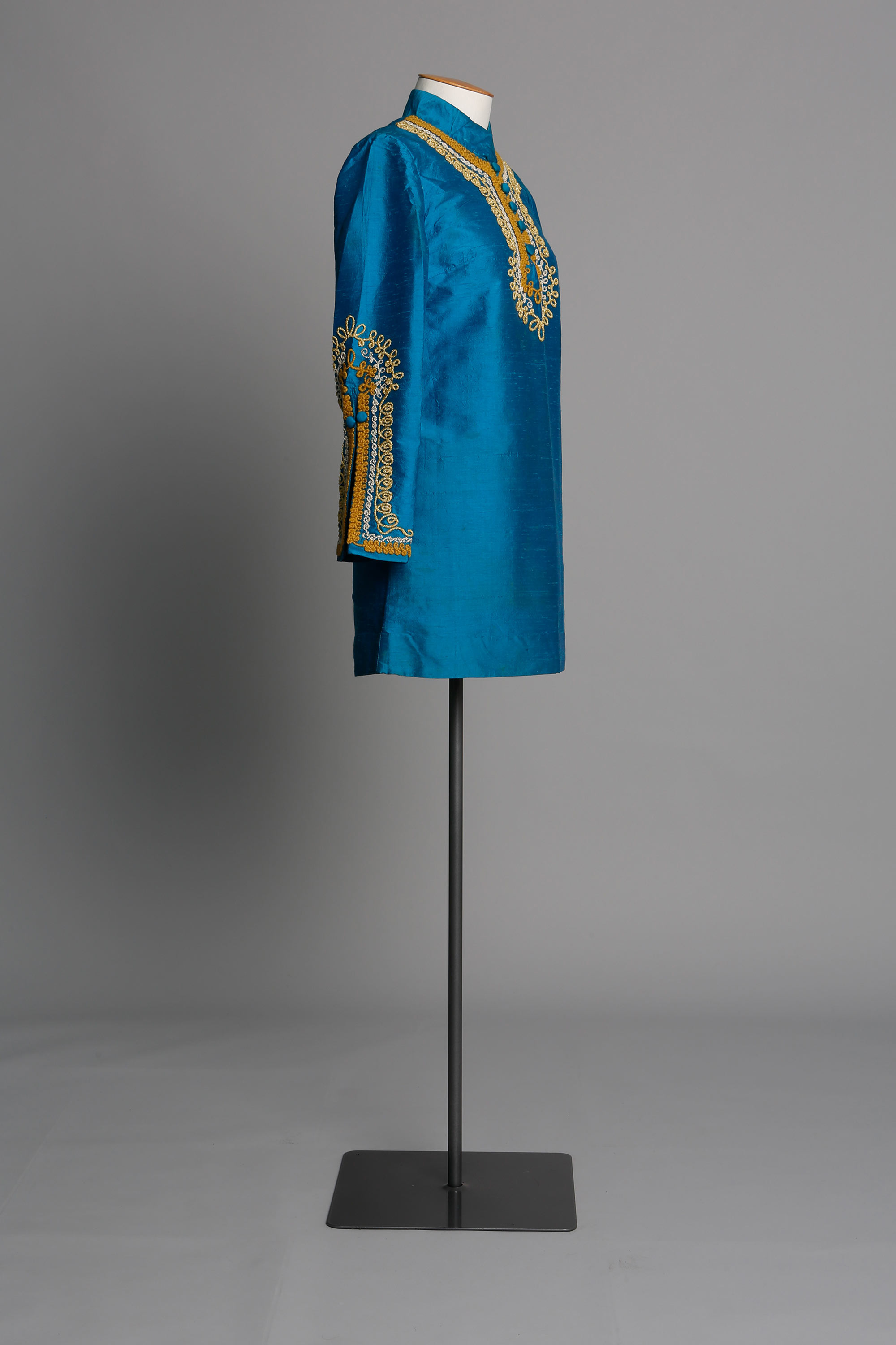 Blue fabric; gold, white and mustard cord