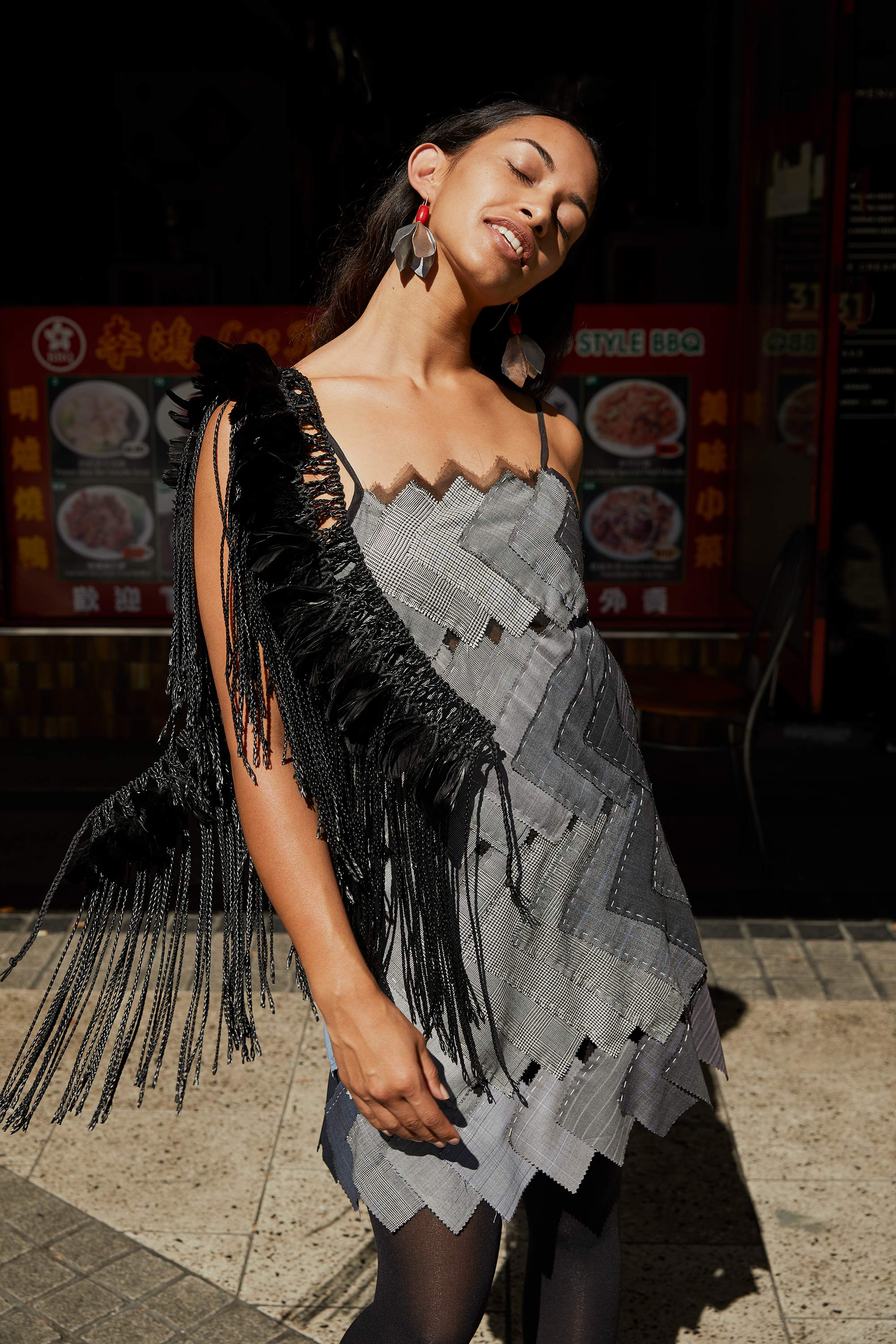 This dress was part of Tarita Georgia Rahui’s graduate collection at Whitecliffe College of Arts and Design in 2018. It showcases a keen sense of symmetry and stitch work. "Comparisons have been drawn to island patterns and tivaevae," says Tarita, who has Cook Island and European heritage. Made from wool fabric swatches gifted by Hawes & Freer, the base of this dress is a silk organza offcut donated by a friend, the straps are made from sand-wash silk bias, and the embroidery is done with organic cotton, unthreaded from offcuts. It is photographed here with a kākahu by Kiri Nathan