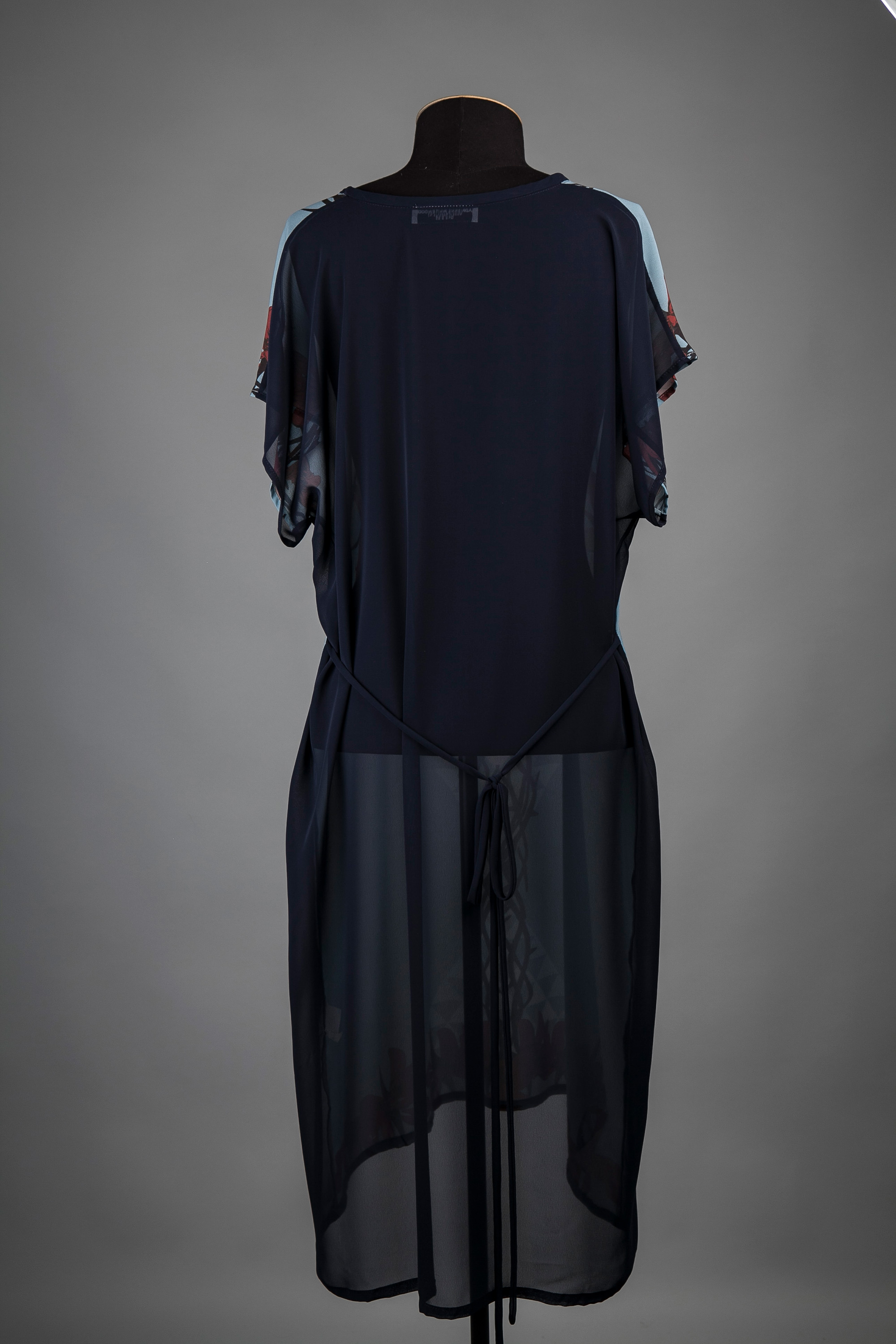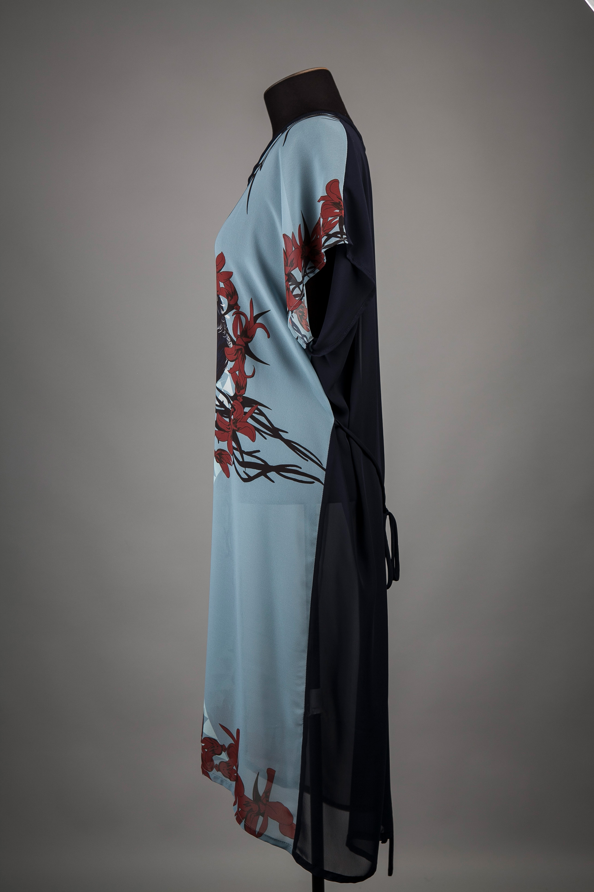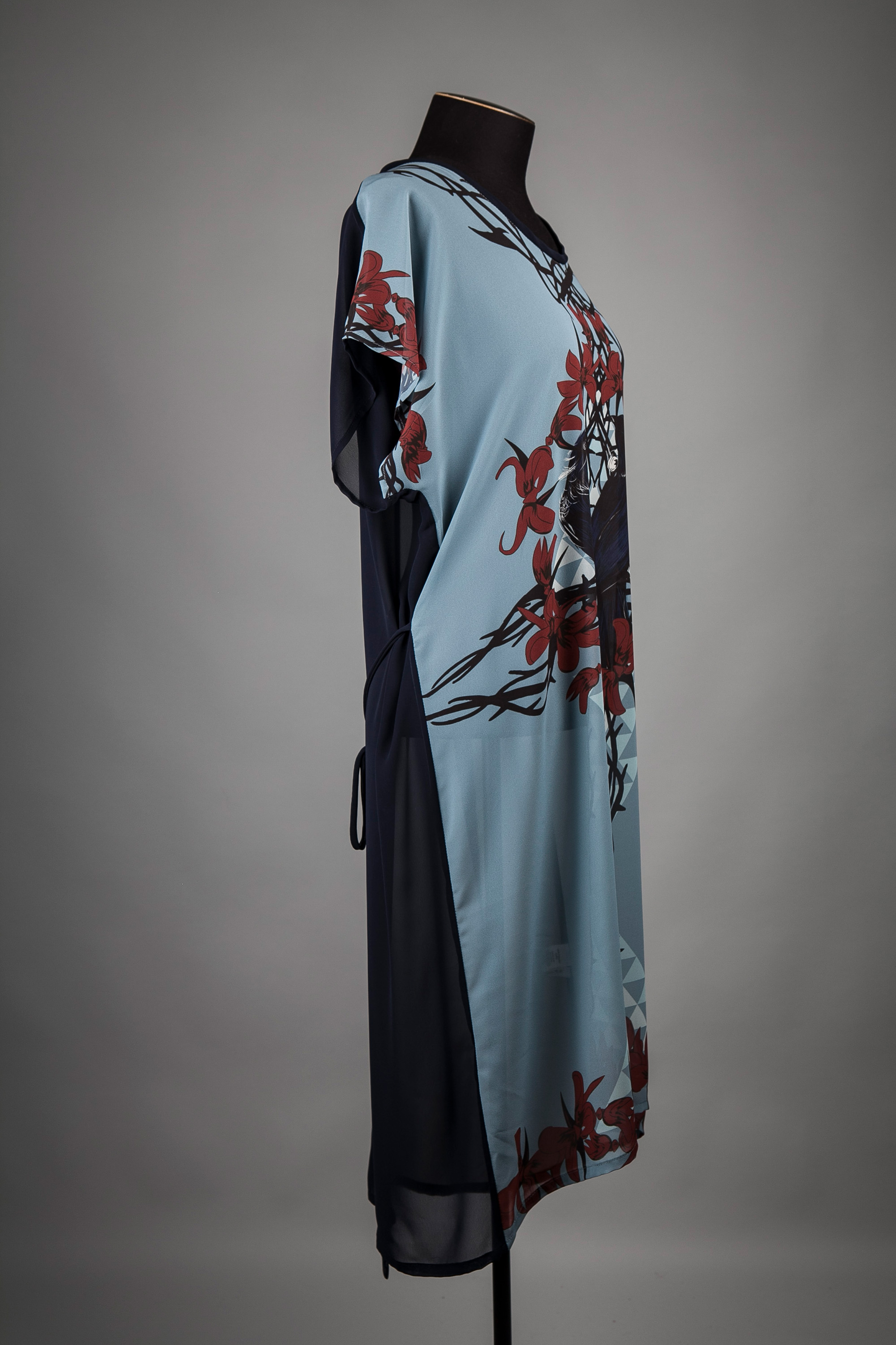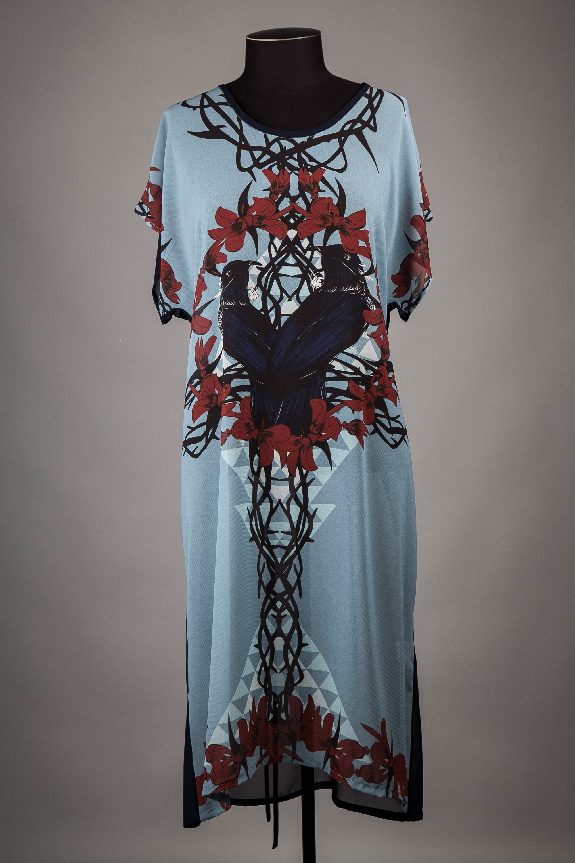 This Tui print dress by Adrienne Whitewood is made of a chiffon type material with a plain blue back and a light teal front. It features two tui at the chest surrounded by a wreath of red flowers with a cross of thorns that extends down the length of the dress. It has ties on the back to secure to the wearer’s waist.