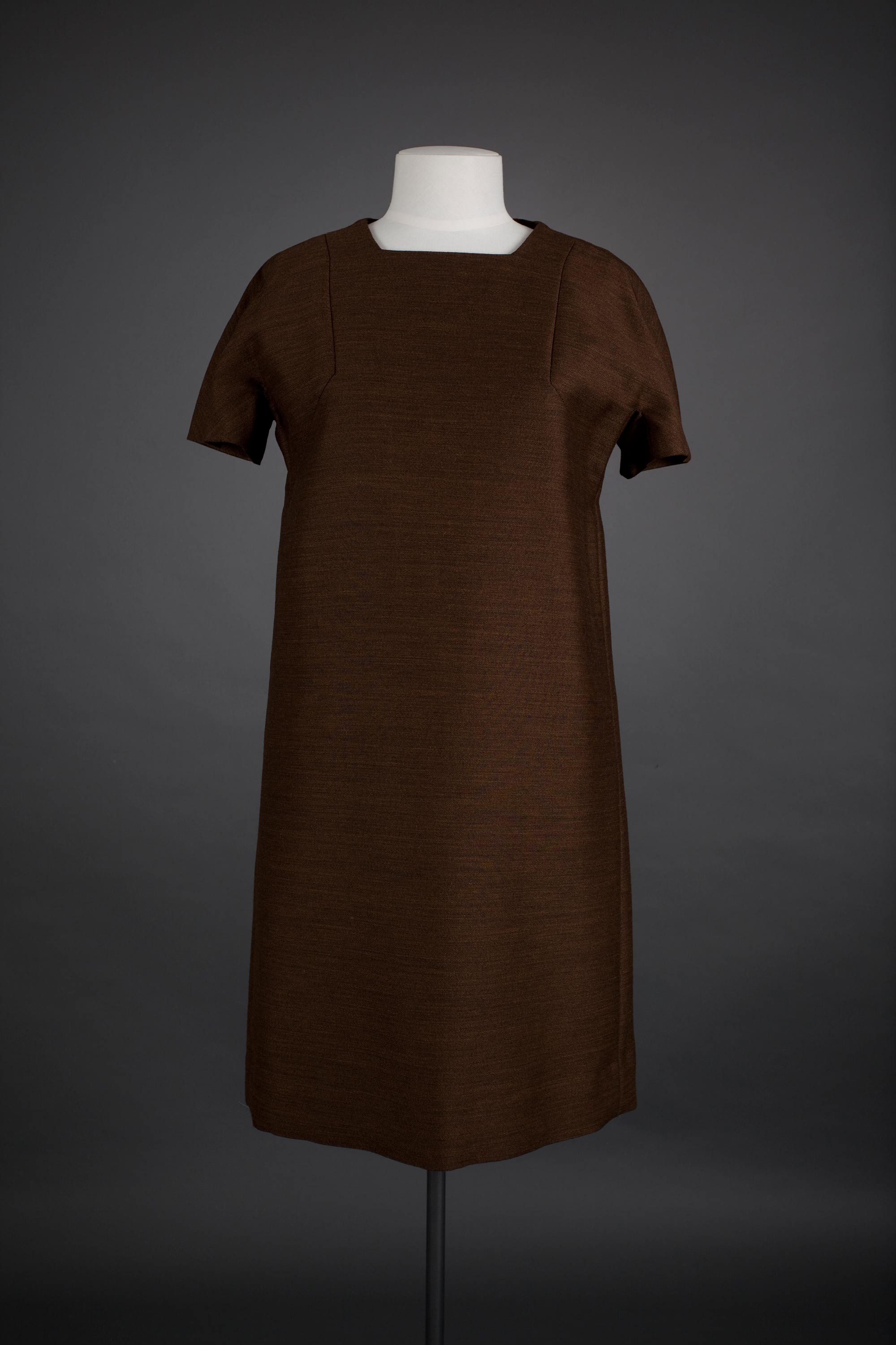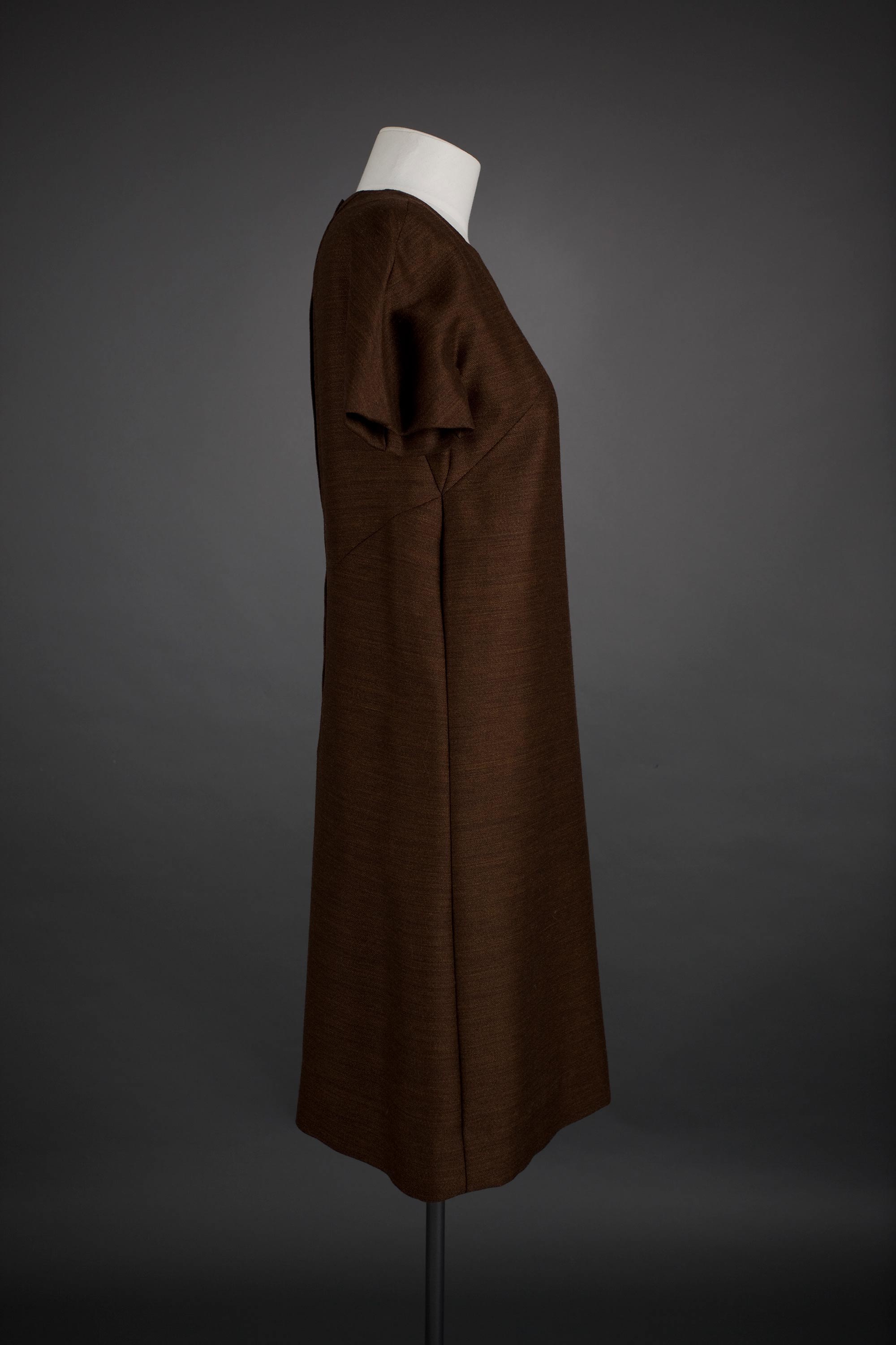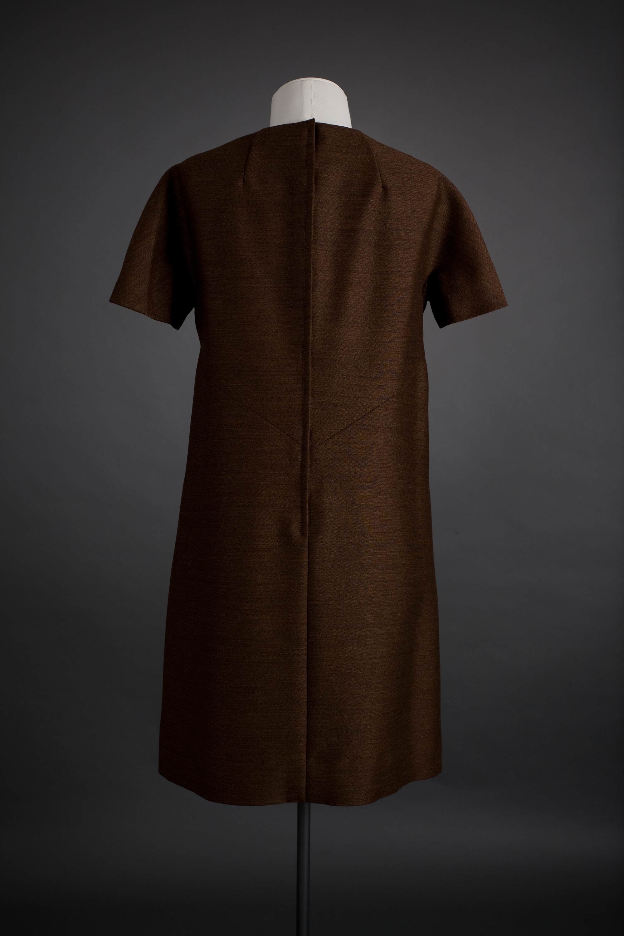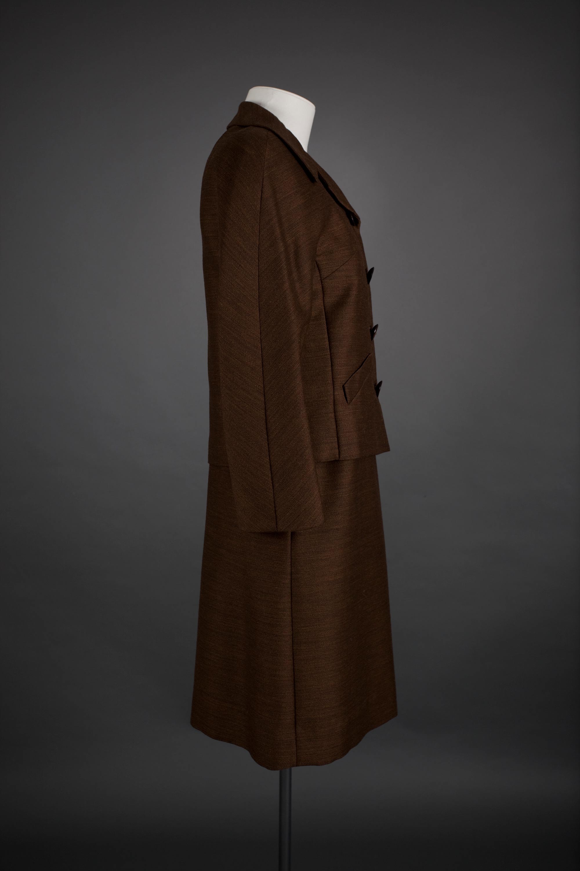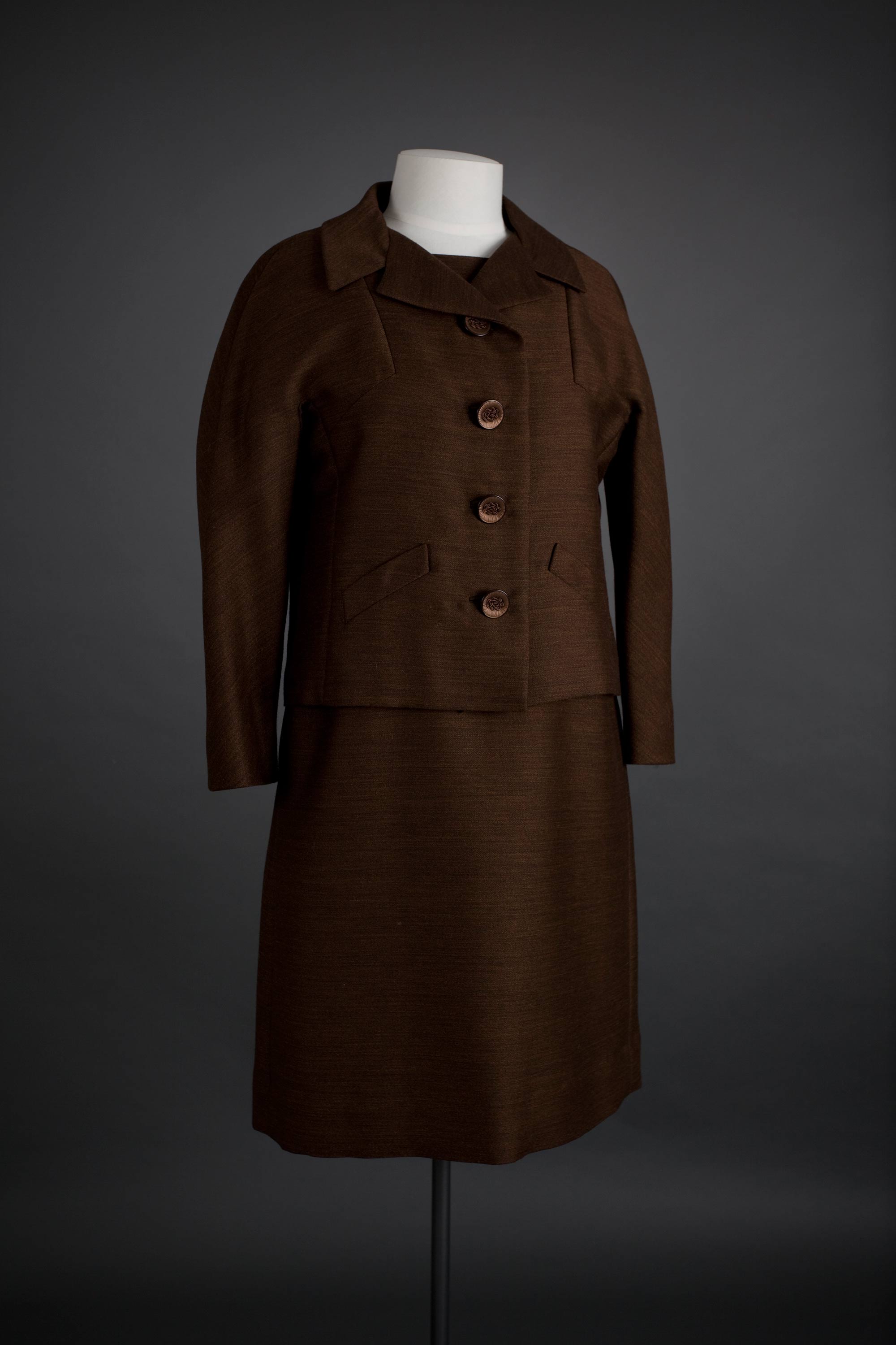 The jacket and dress have cut on sleeves and are shaped using slashes and deep darts.